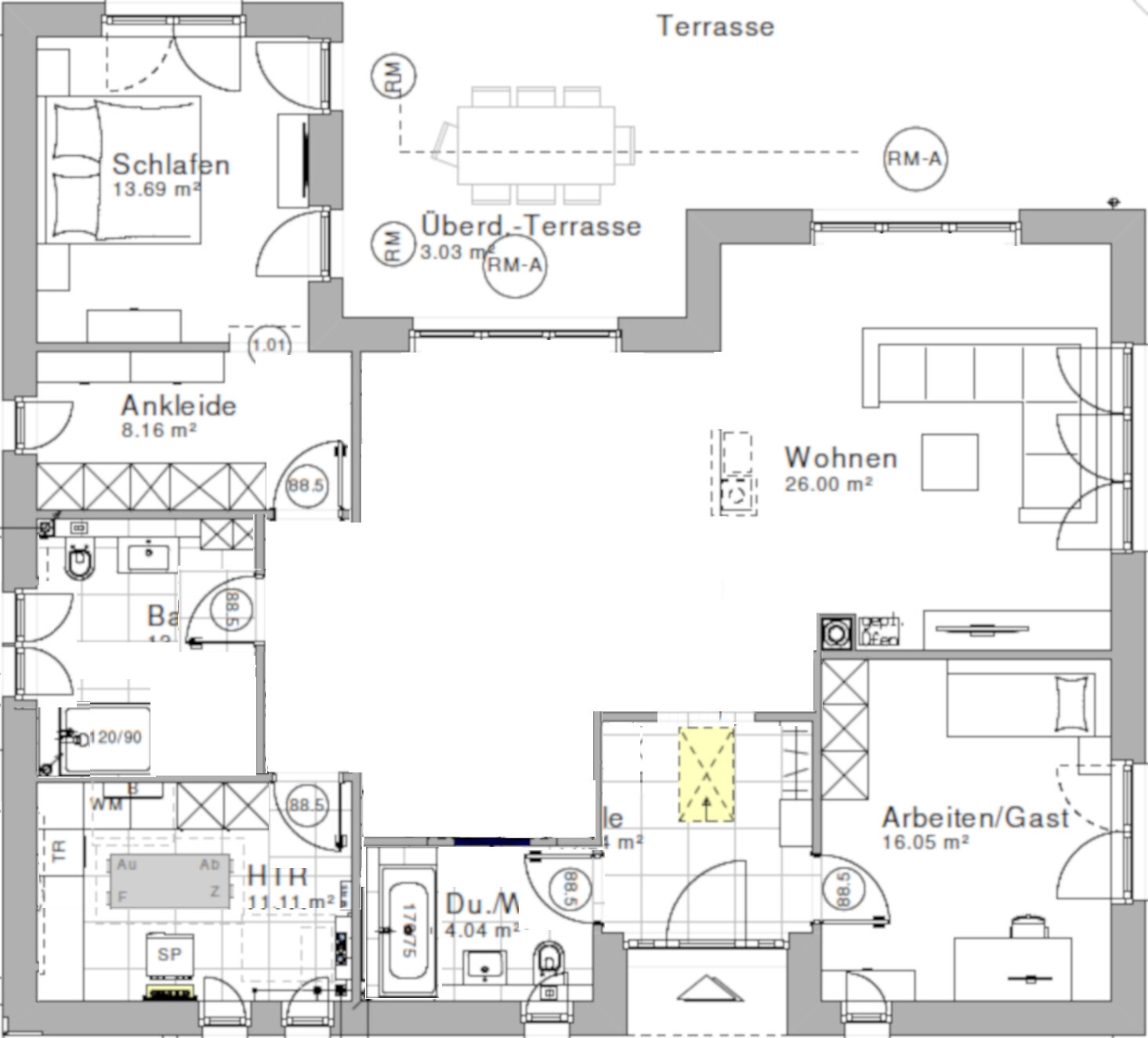 Das zweite Du-WC ist für Gäste oder pflegebedürftige Eltern im Alter.Och Mensch, da fehlen doch wieder die Informationen, die der Fragebogen klären könnte.Ich würde den langen Flur für 3 Meter Garderoben- und Putzschrank verwenden.