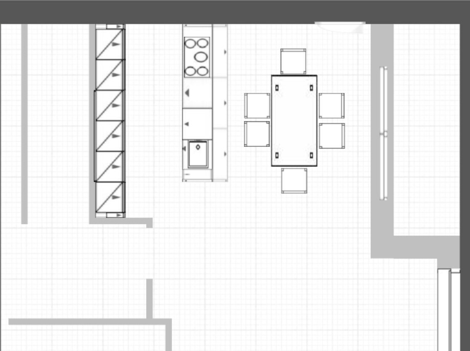 Die Wandzeile planlinks ist ca 60cm tief, min Zeilenabstand 110cm, Insel min 90cm tief, verbleiben 290cm Abstand für Tisch und Stühle.