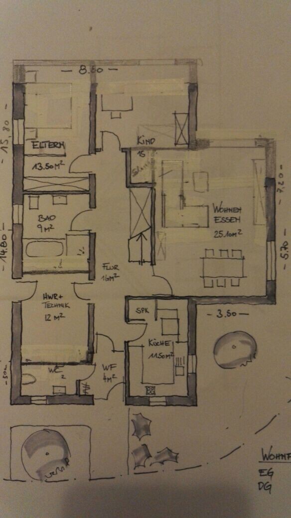 Dazu noch der alte Grundriss etwas umgemodelt. Wobei das überschüssige Zimmer noch drin ist und wegfällt ... Büro-Kind wird zu einem Zimmer und halt bissl kleiner ..