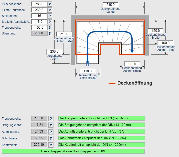 Habe die Treppe online bei "treppenportal-Deutschland *.de* berechnet, sollte sich schön ausgehen, siehe Screenshot. (durch Ändern einiger Maße sollte es sogar noch besser passen)