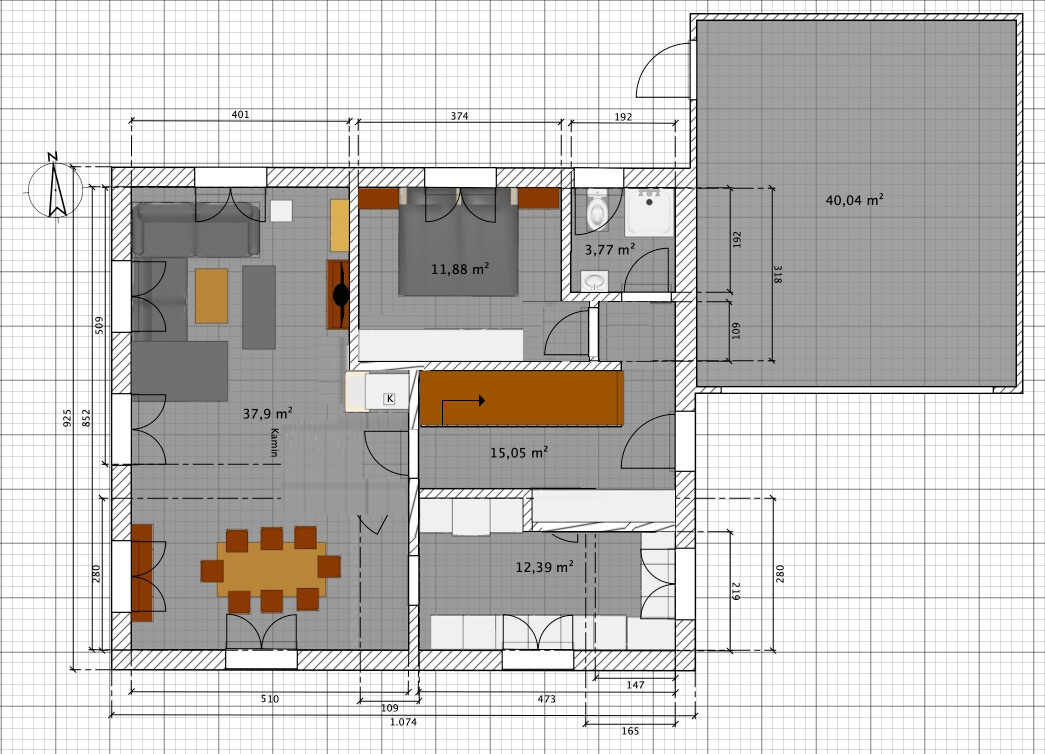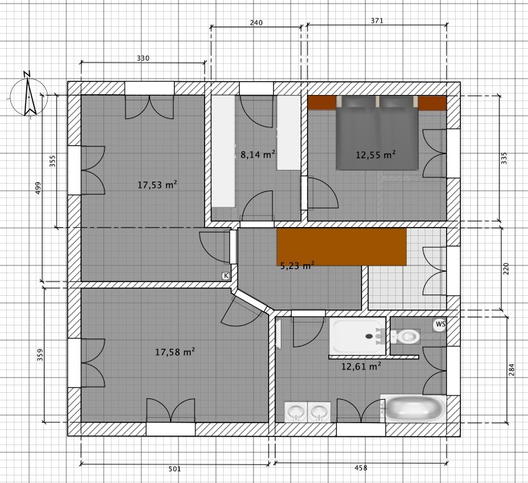 Grundlegend wird es dann (je nach Anbieterwahl) dann bei dem Entwurf bleiben, das Duschbad werden wir versuchen relativ klein zu halten, so klein wie in diesem Entwurf wird es wahrscheinlich nicht bleiben. Das ist aus meiner Sicht, wie auch die genaue Position der Fenster und z.B. der Anschlag der Türen, Finetuning.