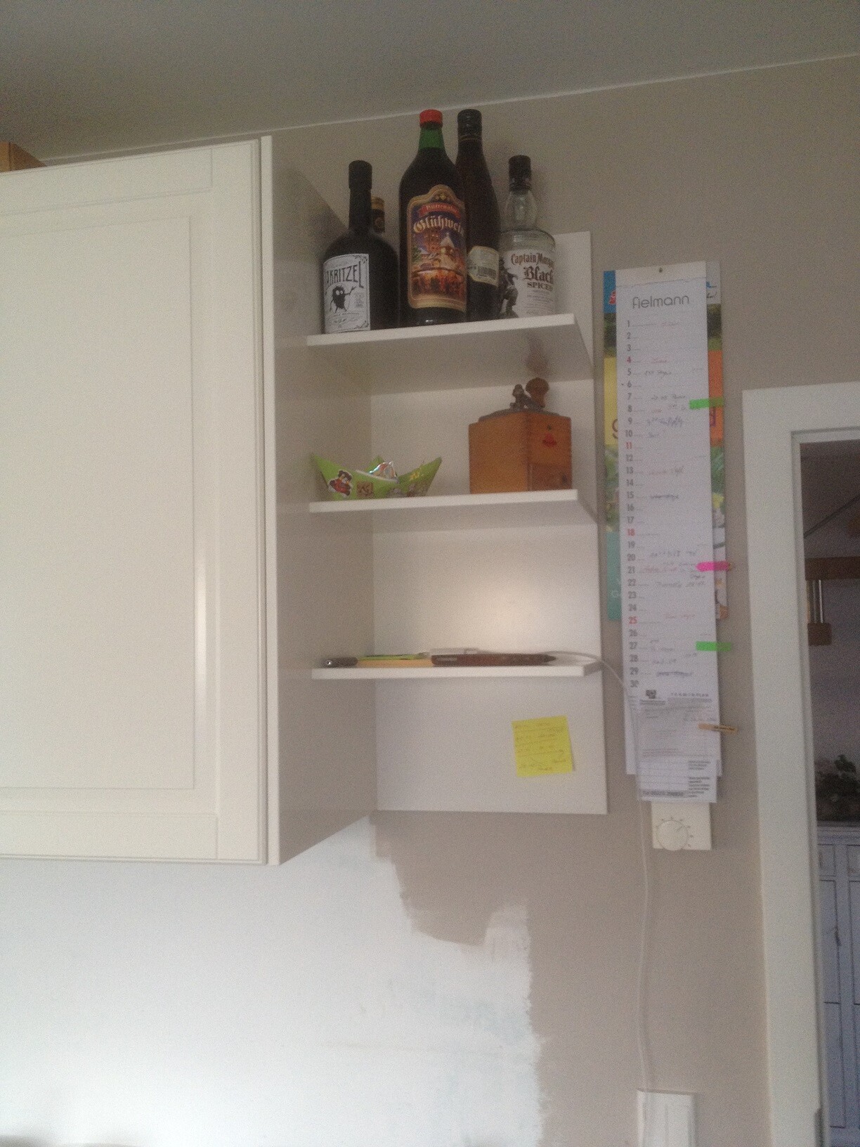 Das Eckregal habe ich mir aus IKEA Deckseiten zusammengebaut (Eckregal.JPG). Ist zwar vorne nicht im 45 Grad abgeschrägt, aber Frau fands auch OK, also Projekt (bis auf Nieschenverkleidung) abgeschlossen.