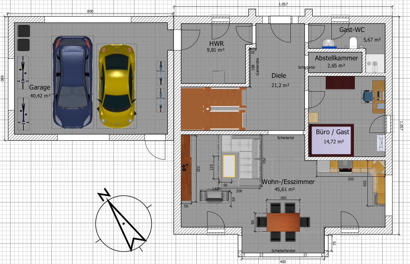 Kurze Anmerkung zur Garage: Du wirst da nie bequem zwei Autos zusammen mit Fahrrädern rein bekommen - ich bin den Zeichnungen auch lange auf den Leim gegangen .