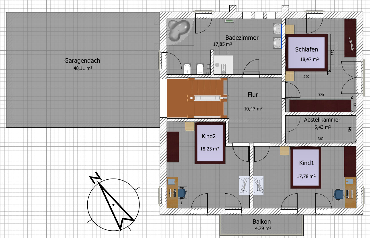Die Kinderzimmer und die Abstellkammer gefallen mir von der Anordnung irgendwie nicht. Ich glaube es sieht auch nicht gut aus, wenn die Türen direkt nebeneinander sind. Vielleicht findest du eine Möglichkeit die m² die das Bad zu groß ist, für die Abstellkammer zu nutzen und kannst dann zwei Kinderzimmer im planunteren Bereich anordnen.