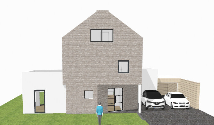 Der Gedanke war halt, die Diagonale weiter fort zu führen, damit sie einen Bezug zum Haus bekommt und nicht willkürlich gesetzt ist. Man sieht, der Eingang wäre Richtung Pkws abgeschrägt (Mauer müsste weg) die Treppe und tragende? Wand im Innenbereich nimmt die Schrägwand auf. Abgesetzt optisch der Anbau als Putz, damit die Scheune auch optisch zu sehen ist.