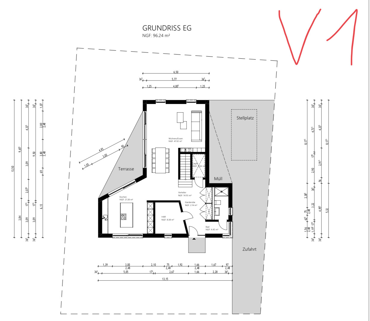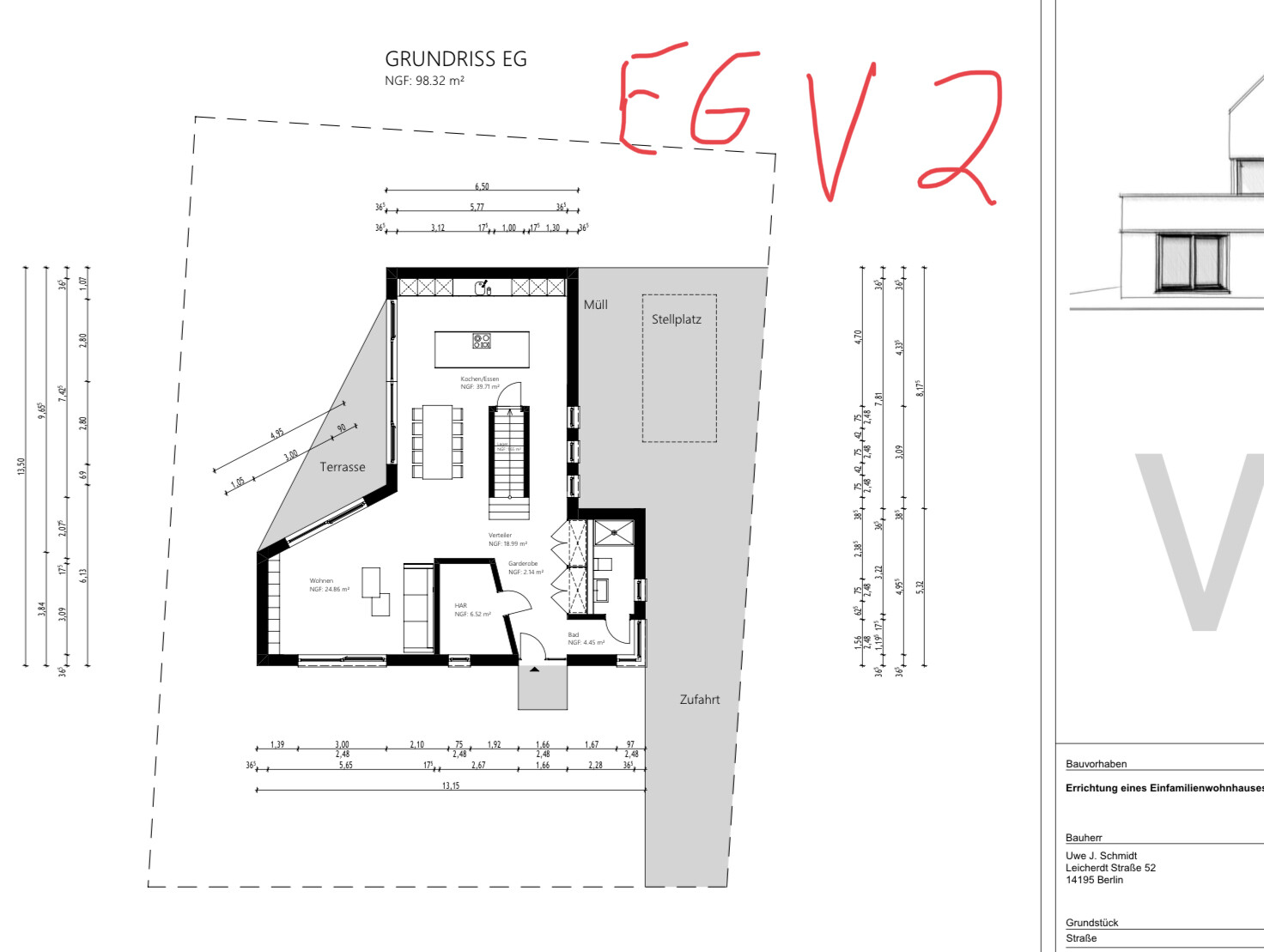 Es gibt zwei EG-Versionen, einmal WZ im linken Flügel, Küche+Essen in der „Scheune“, einmal umgekehrt. Jede Kritik von jedem Willkommen.