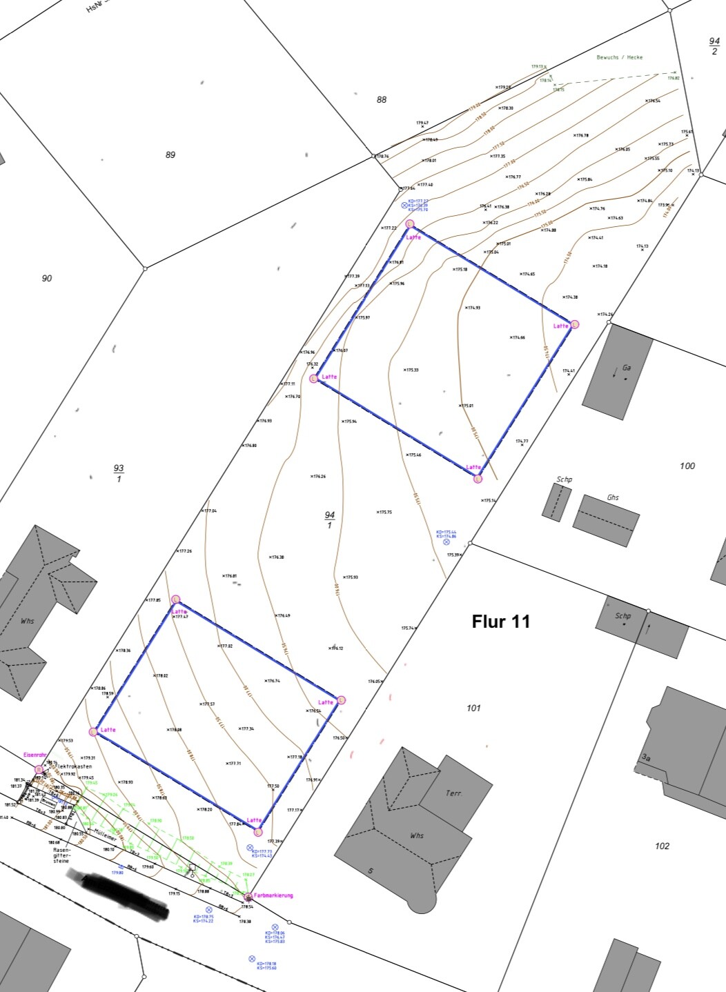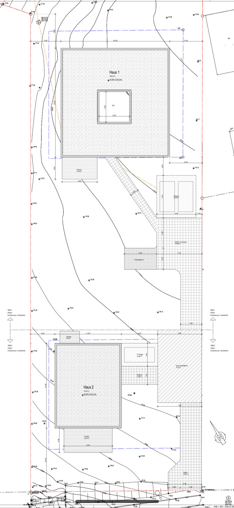 - Ja, das vordere Haus ist leider ca. 2 Meter höher. Da wir die Traufhöhe von 3,5m an der linken Seite einhalten müssen, schwebt das hintere Haus fast komplett über dem Natürlichen Gelände. Eine Begradigung der Flächen ist vorgesehen, es wird aber nicht komplett auf das vordere Niveau aufgefüllt. Wir müssen relativ viel Mutterboden abtragen um gründen zu können, das soll alles auf dem Grundstück verbleiben und dann bei der Außengestaltung verteilt werden.