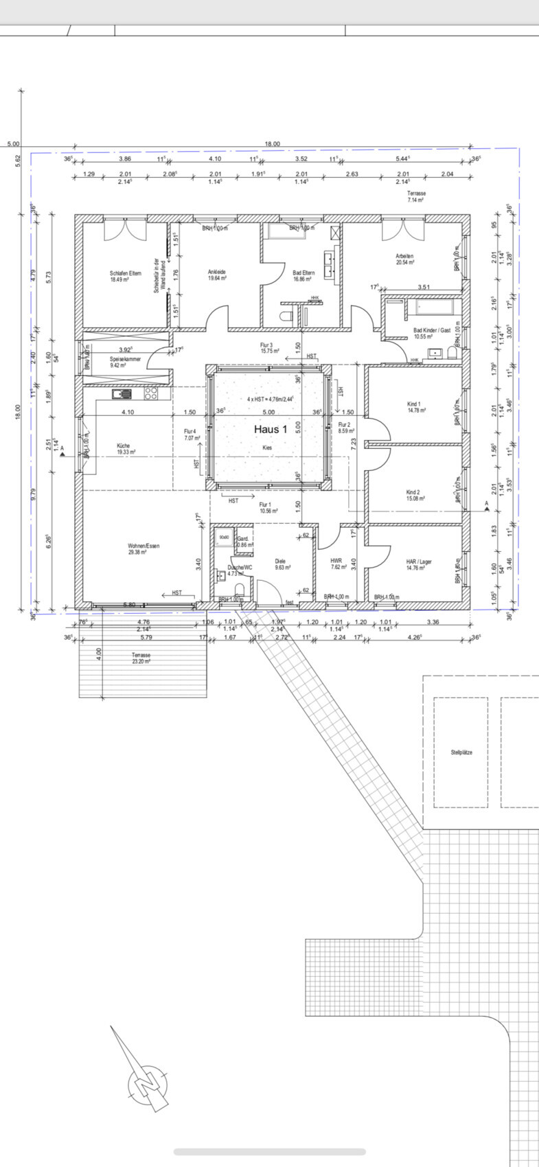 Im Atrium ist erst mal nur Kies eingezeichnet weil mehr nicht um Preis von GU berechnet wurde und da durch das Gründungspolster automatisch Kies sein wird. Offiziell ist die Grundflächenzahl erschöpft aber irgendeine Gestaltung dass man sich da vernünftig und schön aufhalten kann ist geplant.