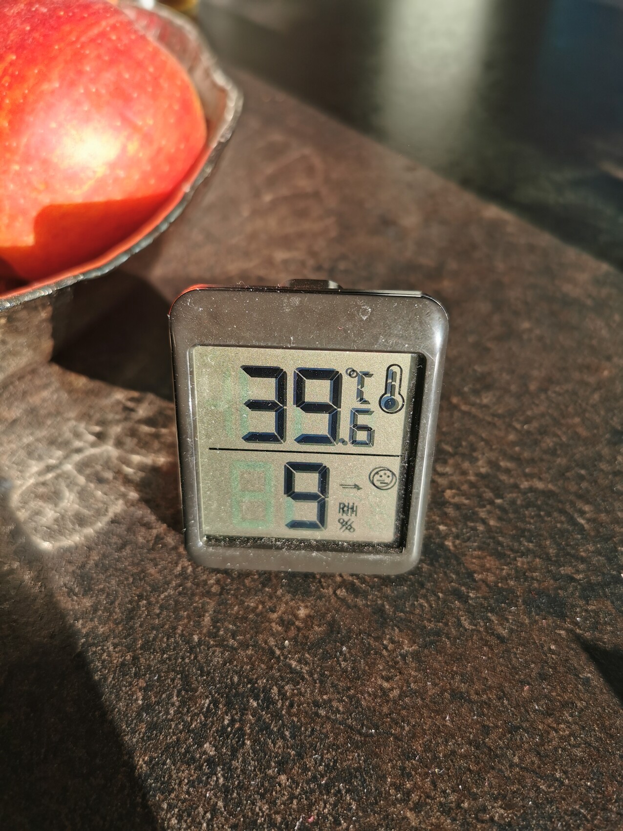 Kleines digitales Thermo-Hygro-Messgeraet auf dunkler Küchenarbeitsplatte neben einem Apfel