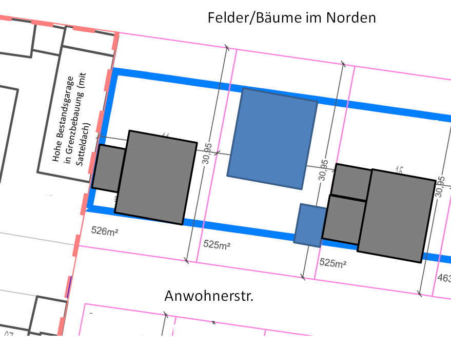 kbt09 schrieb:Sehr aufmerksam, hier hatte ich in der vermassten Skizze noch damit spekuliert, dass ich 1/2 H als Abstandsfläche machen kann für den Schuppen. Mittlerweile wurde allerdings klar, dass ich den Schuppen nur als Grenzbebauung mit 3m Länge machen kann (6m hat schon die Garage an der gleichen Grenze, und pro Seite sind Max 9m erlaubt). Insofern hat der Schuppen nun 4,25 x 3m in der farbigen Skizze. Falls er denn an der Stelle bleibt...
