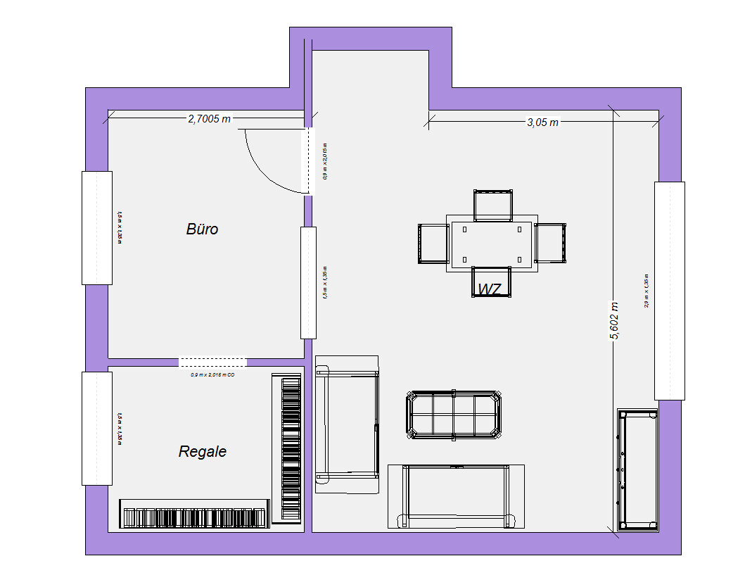Im Büro sollen wie in der 2. Variante eingezeichnet, zwei Schreibtische untergebracht werden, sowie 2 Regale.