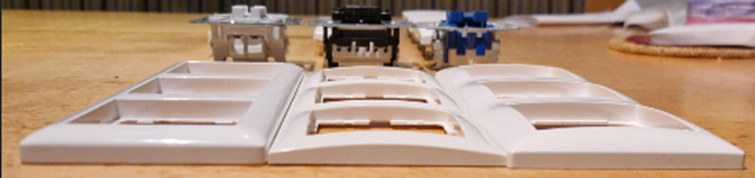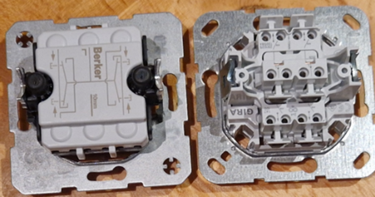 Man benötigt für den Schaltereinsatz von Gira (am Bild jeweils rechts)eine etwas tiefere Dose, da die linken zwei Taster und die rechten zwei Taster separat versorgt werden können und der Draht nicht von der Seite, sondern von hinten gesteckt wird.
