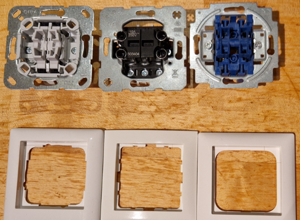 Die Ausnehmungen in den Rahmen und der Unterputzeinsätze sind herstellerspezifisch, wobei die Außenabmessungen der Rahmen, der Schalter und der Unterputzeinsätze gleich ist