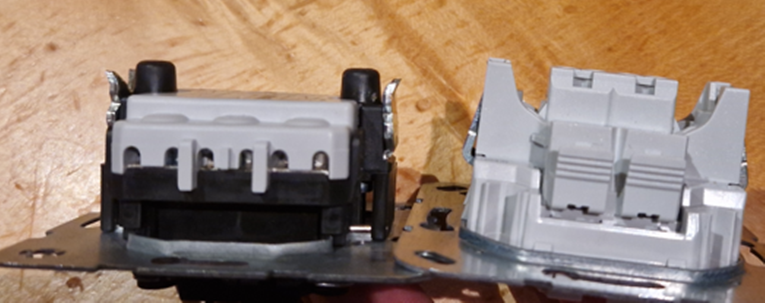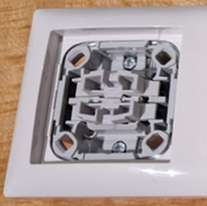 Die Berker S.1 Einsätze passen hier nicht so gut. Der Unterputzeinsatz ist flach so wie beim Busch und Jäger und die Zentrierung erfolgt über die Schalterabdeckung. Diese hat 2 kleine Nasen oben und unten, welche den Busch und Jäger Rahmen zentrieren. Da hier im Rahmen keine Ausnehmungen wie beim originalen S.1 Rahmen sind bleibt hier eine Distanz zwischen dem Blech des UP-Einsatzes und der Schalterabdeckung. Die beiden Haken links und rechts schnappen nicht komplett in den UP-Einsatz. Es hält aber trotzdem. Die Schalterabdeckung passt mit der Rundung sehr gut zum Rahmen. Das Tastergeräusch ist lauter und „grober“ als beim Gira auch der Druckpunkt ist etwas fester.