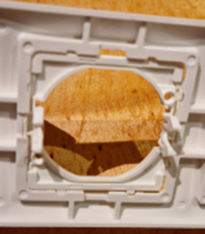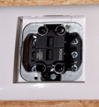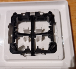 Der Kunststoff am UP-Einsatz vom System 55 passt gut beim Busch und Jäger Rahmen und hat nur wenig Spiel. Die Schalterabdeckung liegt nur an den Ecken auf hält aber den Rahmen gut und sicher. Von außen sieht die Schalterabdeckung nicht harmonisch aus da sie komplett flach ist und an den Ecken daher stärker übersteht. Der Schaltpunkt ist sehr gut und das Klick-Geräusch beim Tasten ist angenehm.