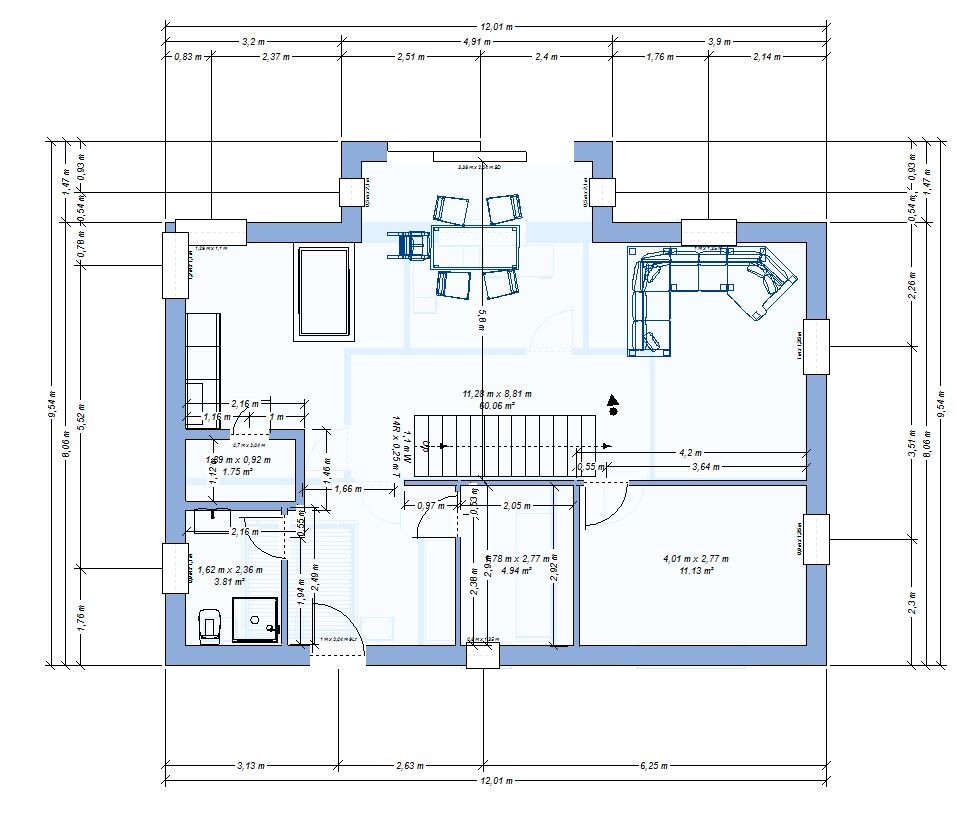 Mein Problem bei der Planung ist eben das wir den Eingang eigentlich gerne auf der kurzen Seite hätten, wenn ich von den verbleibenden 7,2m innen die Küche +Treppe abziehe bleibt ein Rest von ~2m die für Flur + Raum reichen sollen... (ich hoffe ihr könnt meinem Gedankengang folgen )