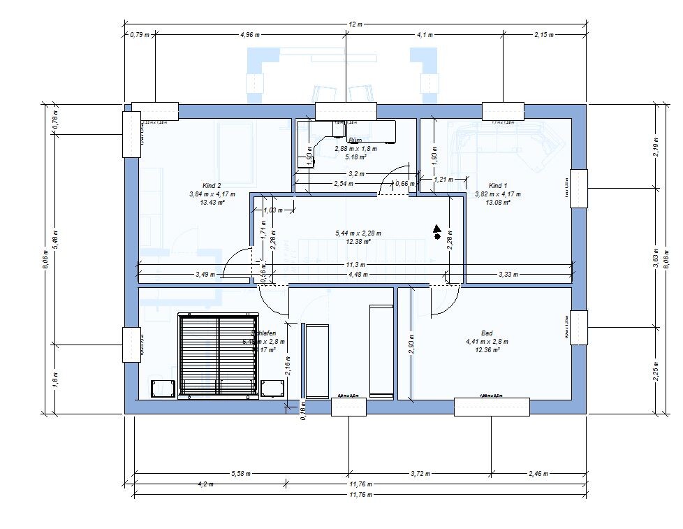 Grundriss eines Hauses: mehrere Räume (Kind 1, Kind 2, Bad) mit Maßangaben und Wänden.