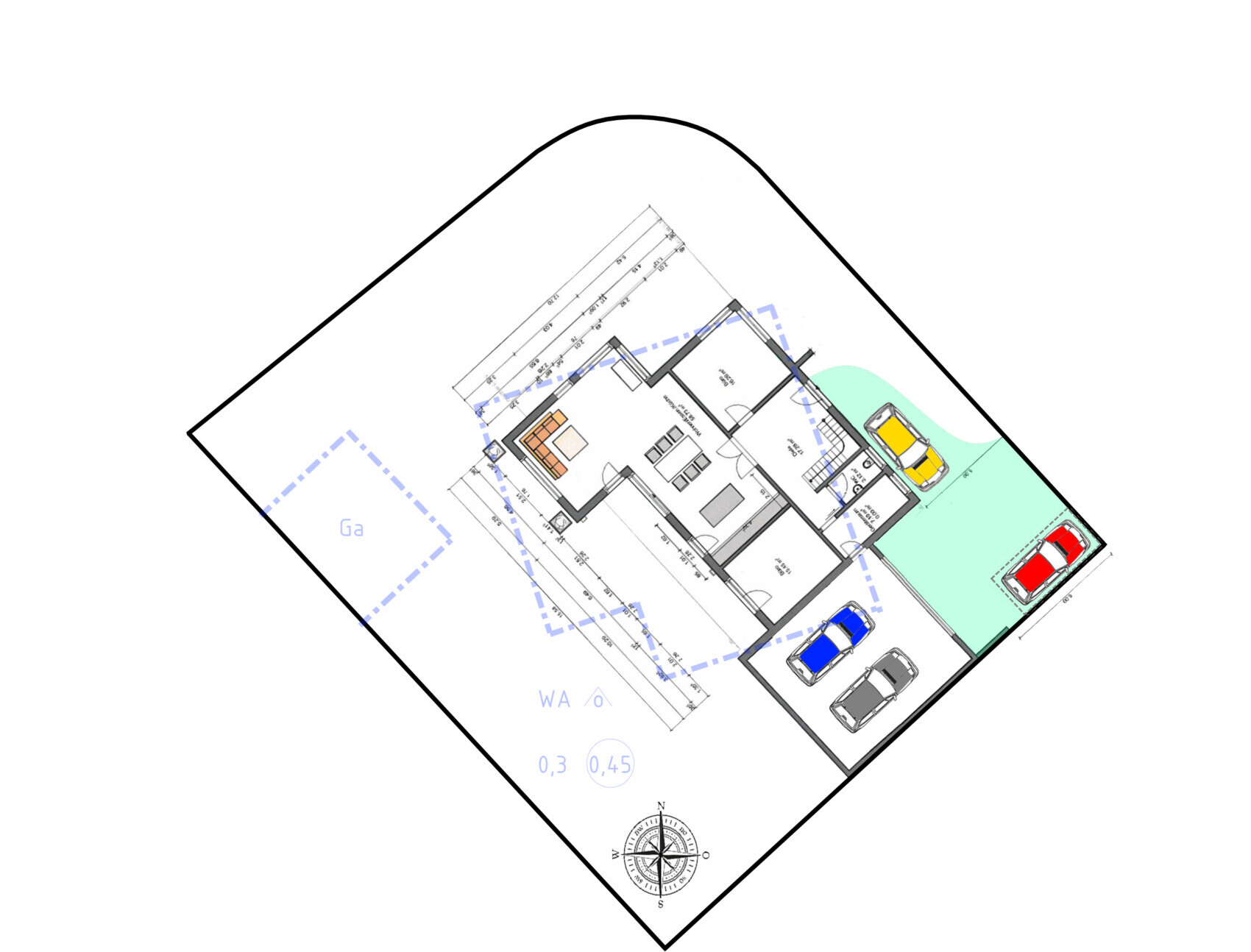 Ich bin auf der Suche nach Lösungen für das Stellplatzproblem ohne groß das Haus anzupassen.Hier mal mit vier freien und einem gefangenen Stellplatz. Die ausnahmsweise Anerkennung des einen Stellplatzes im Stauraum vor der Garage sollte Dein Architekt der Genehmigungsbehörde mit Verweis auf nur eine Wohneinheit, der weniger als 5% betragenden Überschreitung von 200m² und des Drei-, vielleicht mal Vier-Personen-Haushaltes leicht machen.Samantheus schrieb: