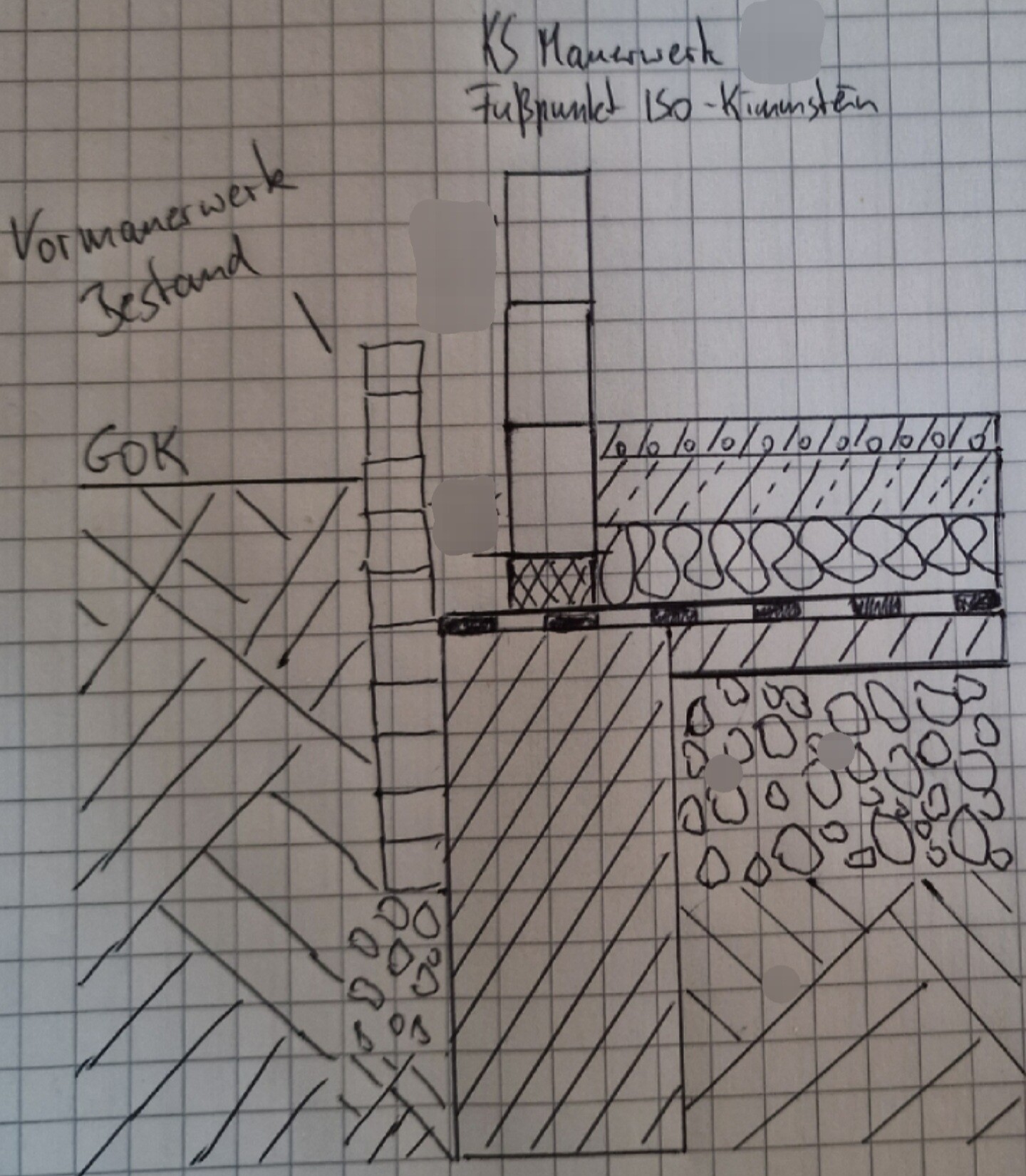 Ich habe den Aufbau mal versucht zu skizzieren. So hat es zumindest der Planer durchgeplant. Die Streifenfundamente waren aufgrund der Bodenbeschaffenheit notwendig und das Vormauerwerk ist Altbestand und musste erhalten werden. Der Estrich sollte als Verbundestrich auf der Bodenplatte liegen zwecks Betonkernaktivierung.