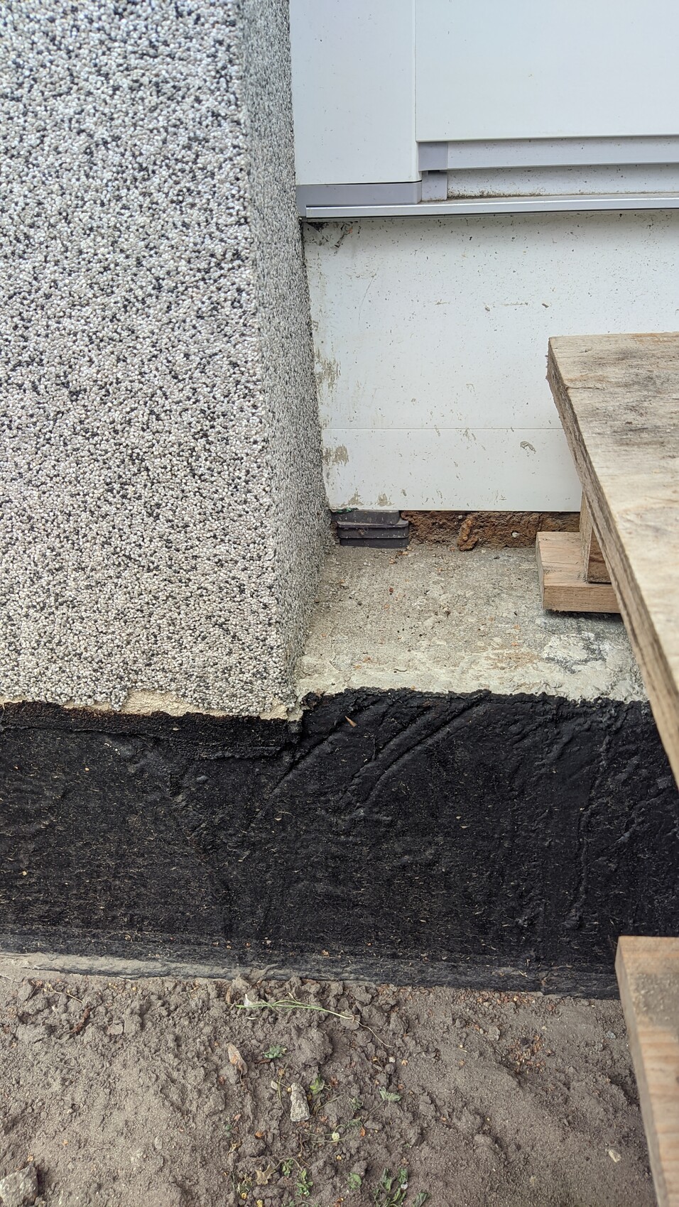 Außenwand-Ecke: grober Putz links, weiße Verblendung rechts, schwarze Bitumenbahn am Fundament.