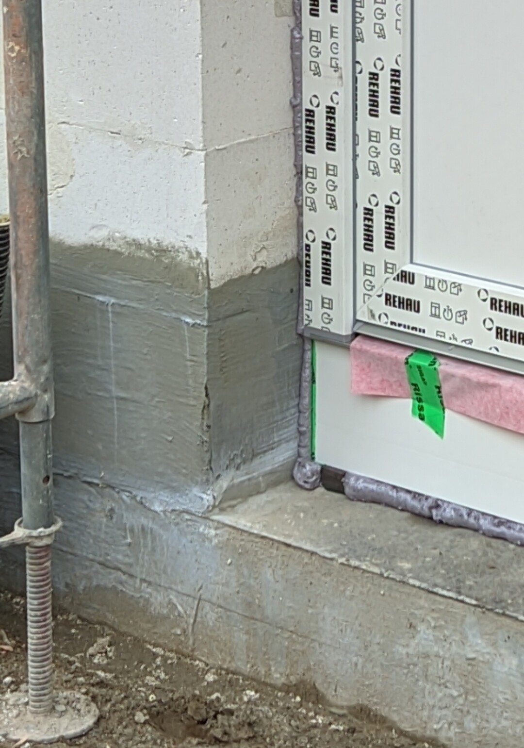 Fensterrahmen aus Kunststoff mit REHAU-Schutzfolie am Betonfundament.