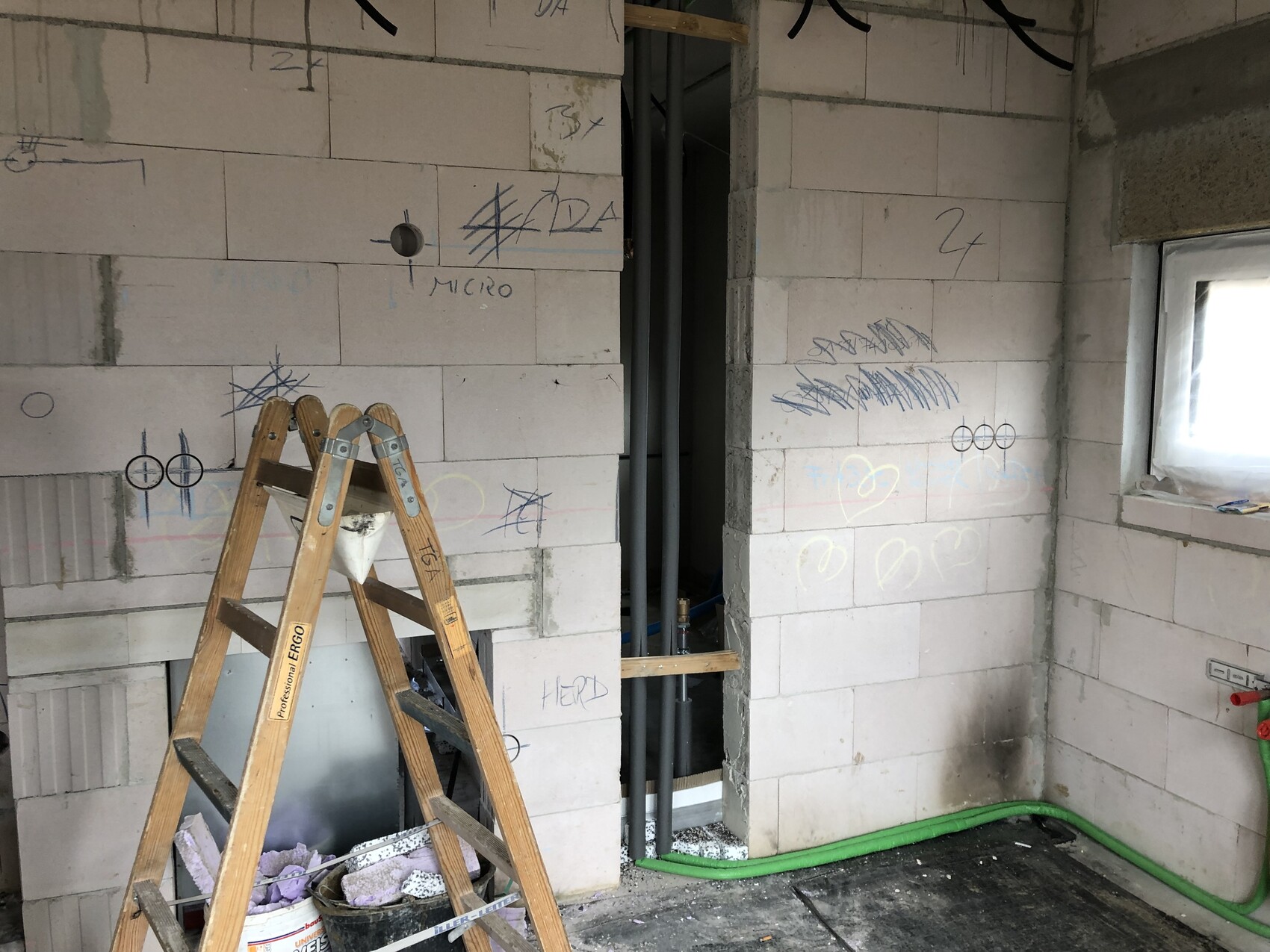 Anfang Mai war der Installateur da. Versteh auch gar nicht, warum das Abflussrohr durch die Bodenplatte soweit rechts geht...