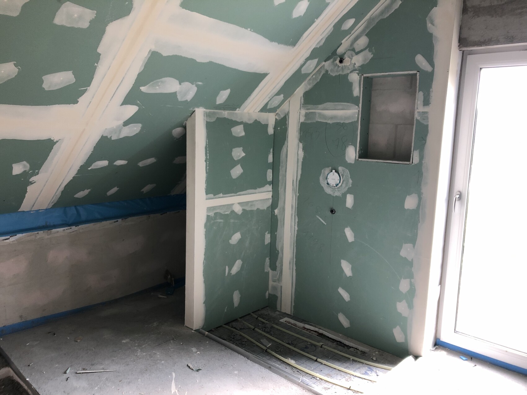 Würde eher mal hinterfragen, was das für eine blaue Folie am Drempel ist (Foto Dusche). Solche PE-Folien als Dampfbremse nimmt man heute eigentlich nicht mehr, weil die zu dicht sind. Kleiner Fehler beim Einbau und schon hast du Feuchtigkeit in der Konstruktion, die dank dieser Folie aber nur schwer wieder abtrocknen kann.