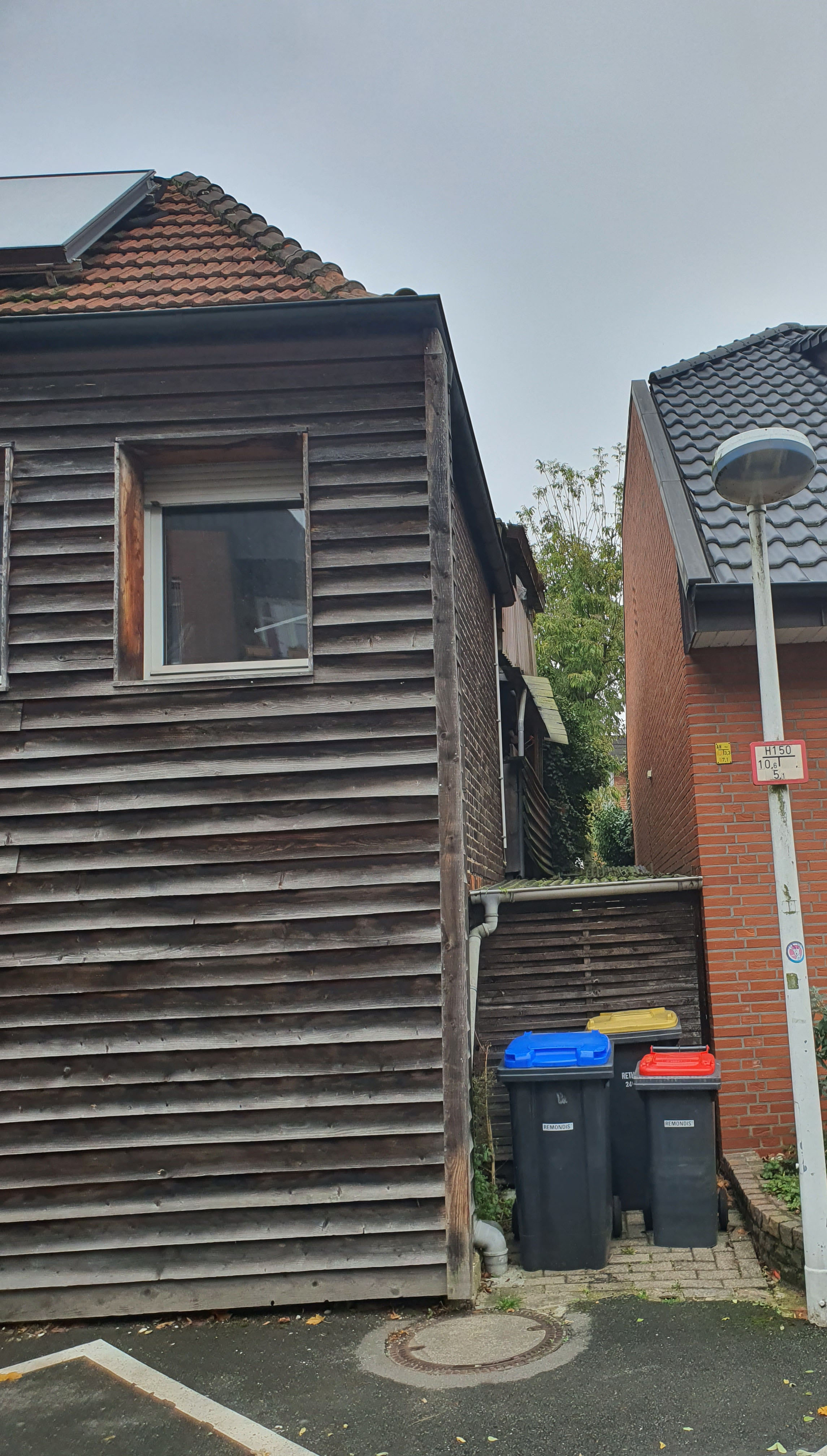 Rechte Seite ist Spielstrasse, vermutlich halbseitige oder ganze Sperrung möglich, links ist Grünfläche bzw. Carport des Nachbarn, nicht schön aber machbar. Hinten nur ein Meter zum Nachbargebäude, da wirds sehr eng mit Baugrube & Gerüst etc.