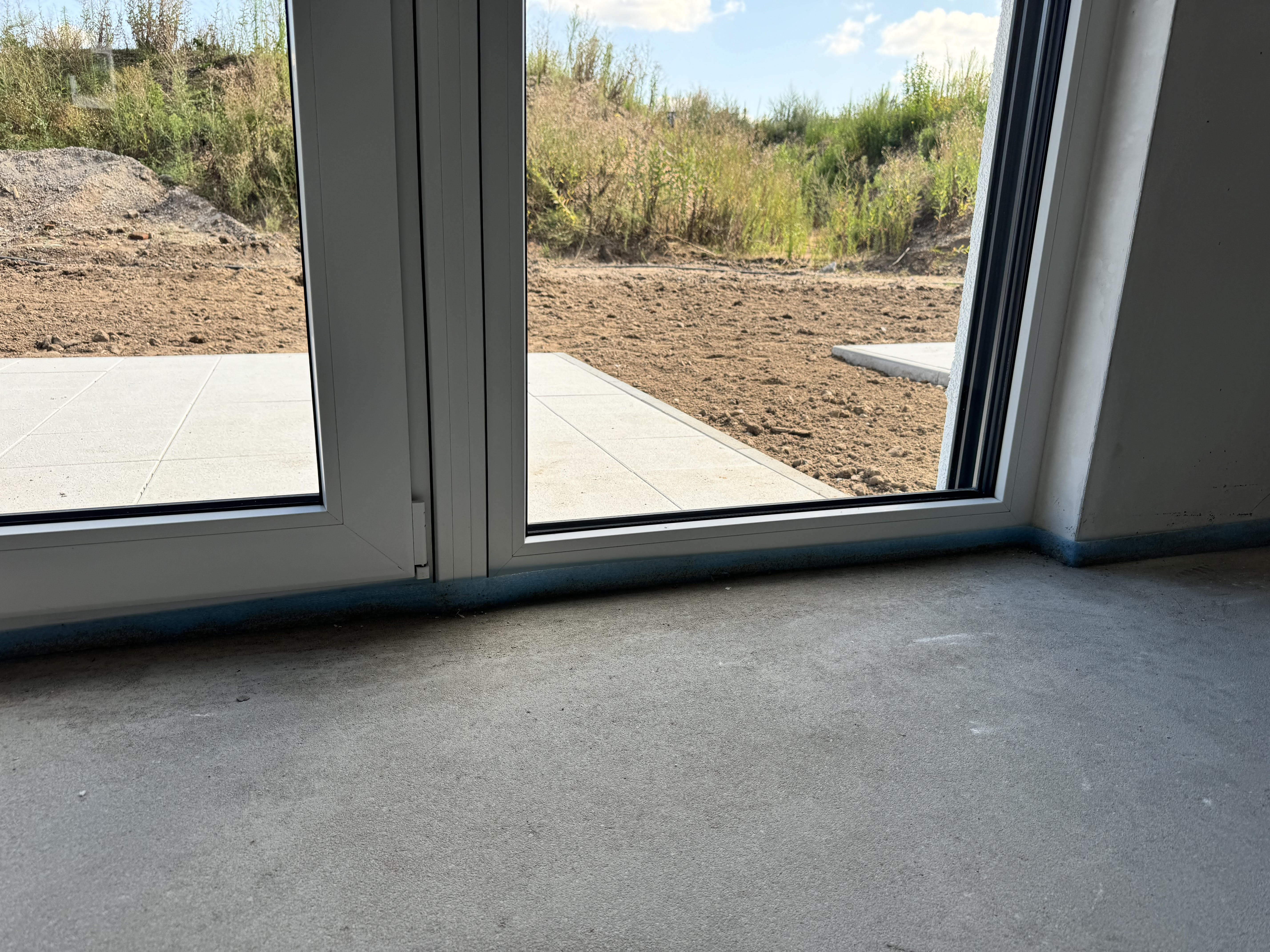 Nun habe ich mir zum Abnahmetermin auch die Anschlüsse des Bodens an die Terrassenfront im Wohnzimmer genauer angeschaut und gesehen, dass ich hier leider nicht wie geplant über die 4-Meter Fensterfront einfach 2 Abschlussprofile bündig platzieren kann. Mir ist aufgefallen, das die Fensterfront rechts und links neben der Terrassentür etwas hervorsteht. So kann ich leider die Abschlussprofile nicht einfach bündig an die Fenster "durchlegen".