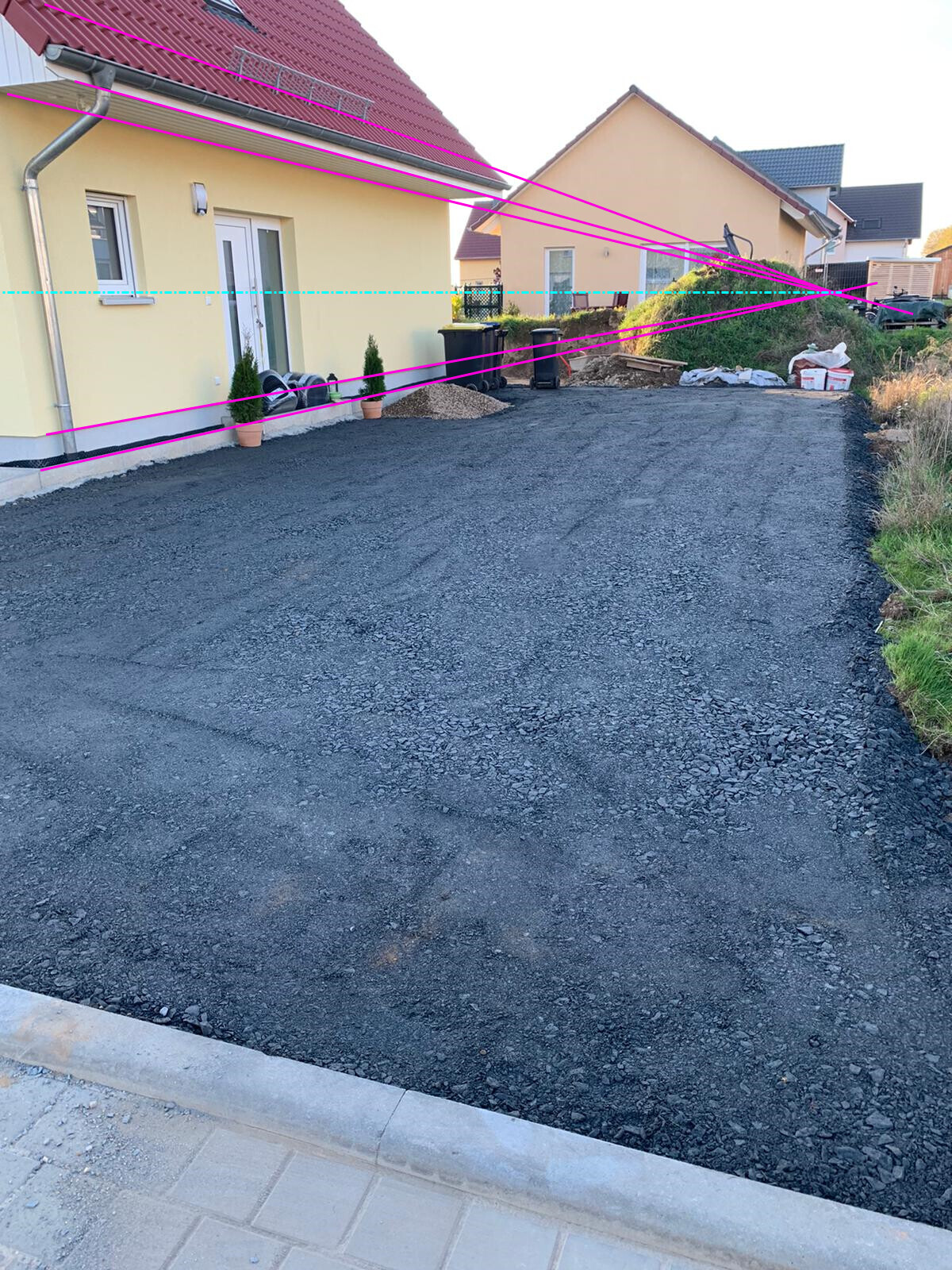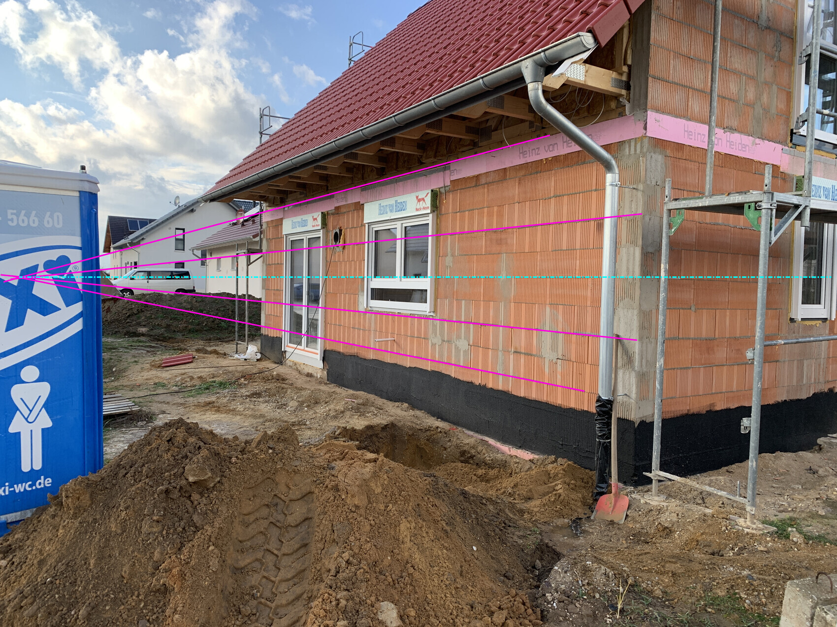 Am Ende kommt’s eben zu einer größeren Stufe zwischen den GrundstückenDie Du aber dann herstellst, weil Du dann Deine Erdhaufen modellierst. Und tu' Dir den Gefallen, den tatsächlichen Höhenunterschied zu messen. Meinetwegen nimm den Gartenschlauch und benutze ihn als Schlauchwaage. Meine Behauptung in #24 war ja nicht aus der Luft gegriffen:Darstellende Geometrie: Parallele Linien schneiden sich in einem Fluchtpunkt. Dieser liegt auf Augenhöhe. Du siehst, der türgriff seiner Terrassentür ist etwas höher als der Griff Deiner Eingangstür. Wieviel genau kann man so natürlich nicht ermitteln, da wir nicht wissen, in welcher Höhe Dein Türgriff angebracht wurde und auch nicht seiner. Aber seine Oberkante Fertigfußboden liegt ziemlich sicher nicht 50cm über Deiner. Oder nimm die Terrassenstühle. Hast Du das Foto stehend gemacht? Dann läge die cyan-farbene Linie auf Straßenhöhe + Augenhöhe =196,7 + 1,6 = 198,3; seine Terrasse auf 198,3-1,2= 197,1, also 5cm über natürlichem Gelände am Haus.