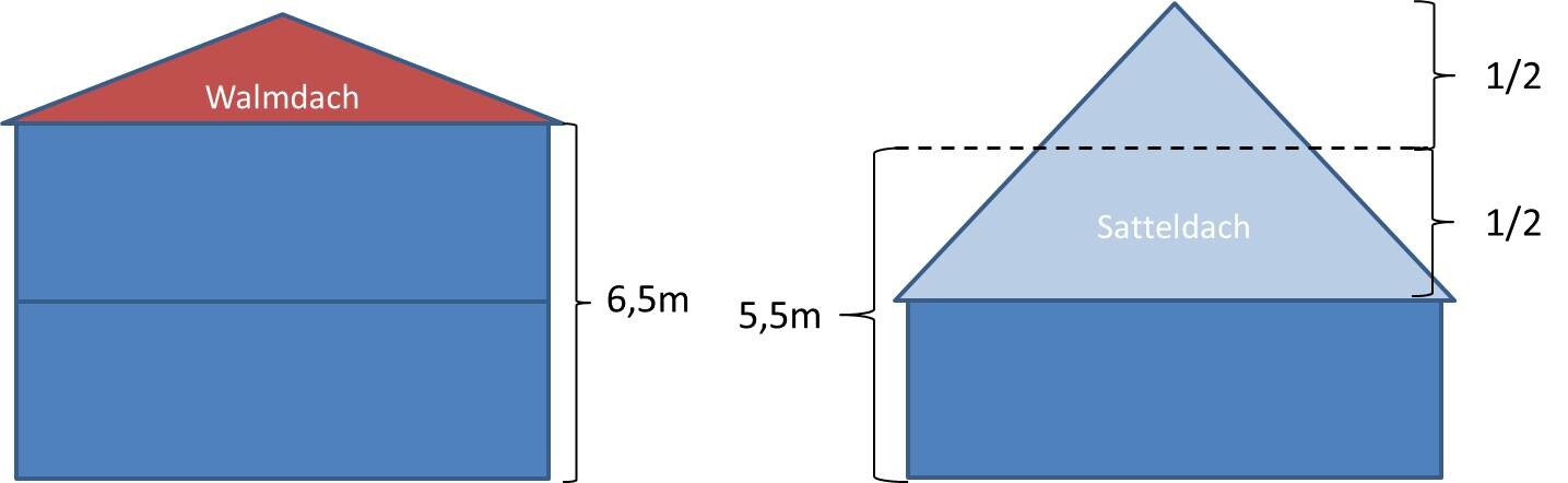 Diagramm zeigt Walmdach und Satteldach auf Gebäudeteilen mit Maßangaben 6,5m und 5,5m