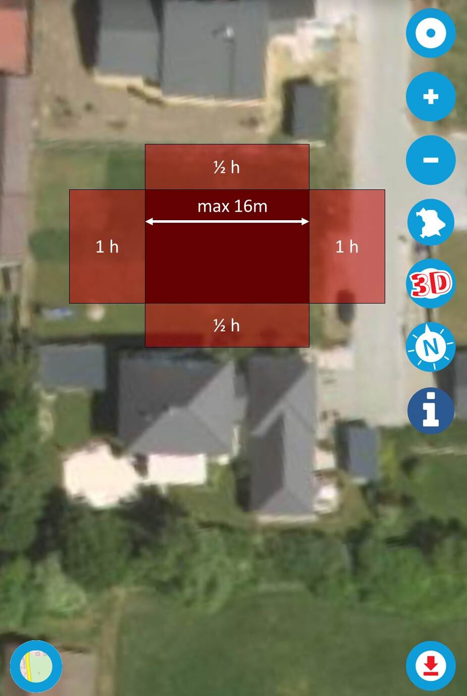Luftbild eines Hauses mit rotem Overlay: zentrales Dunkelrot, umliegende Zonen Hellrot.