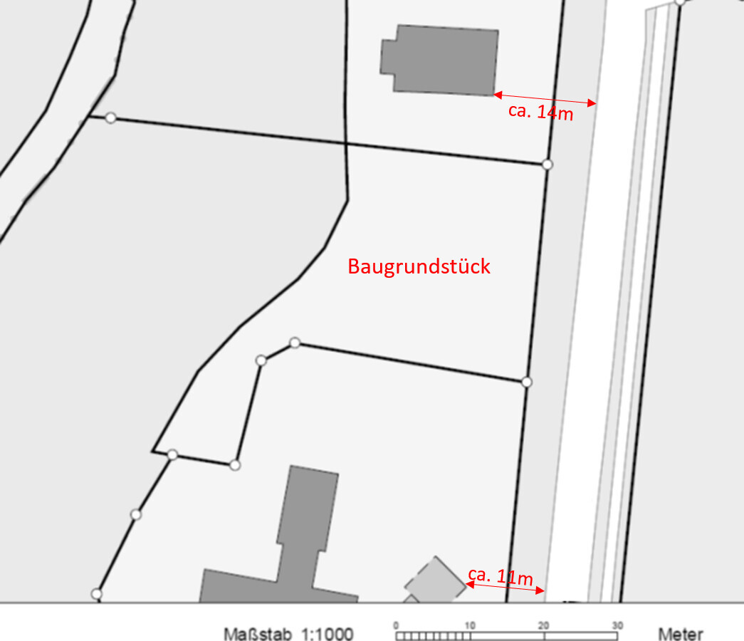 Im Süden liegt das Haus weiter zurück, aber Schuppen/Carport sind ca. auf 11m an der Straße dran.