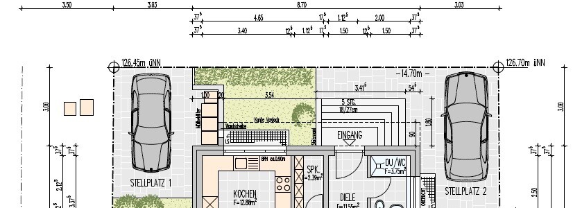 Evtl. würden wir das Haus dann auch noch weitere 60 cm in Richtung Garten schieben, um auch die Eingangsüberdachung wie geplant realisieren zu können. Das hängt ein bisschen davon ab, welche alternativen, Landesbauordnung-konformen Eingangsüberdachungen wir finden.
