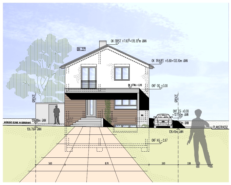Wir würden das Haus dann auf jeden Fall mal 30 cm nach hinten schieben, um die Eingangstreppe wie geplant realisieren zu können, ohne das Haus 10 cm tiefer legen zu müssen und 6 % Gefälle in der Einfahrt zu haben.