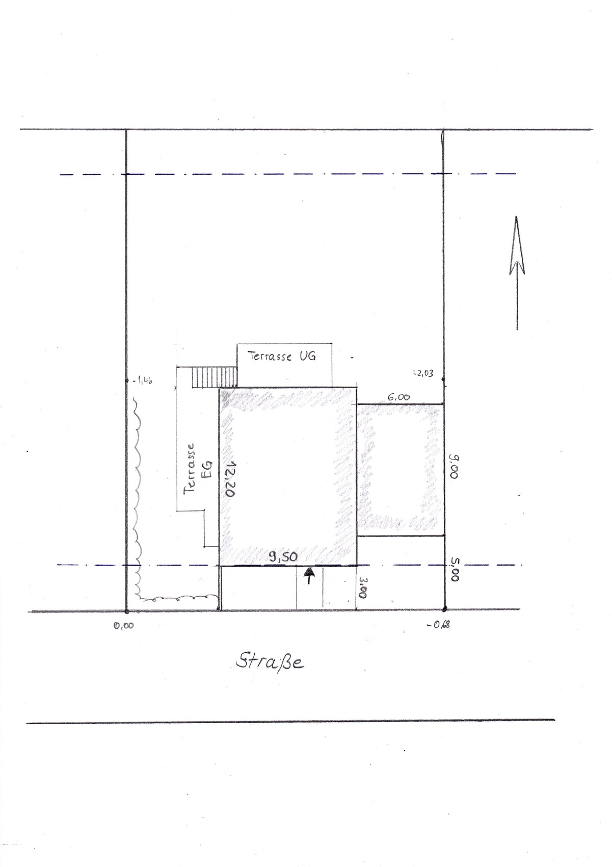 Die Straße ist im Süden (unten im Plan), der große Abstand der mich stört (oben im Plan ) ist Norden.