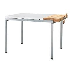 es gab mal bei IKEA einen Tisch mit weißer Platte (rechteckig) und einem Stück angesetzt aus hellem Massivholz, an dem ein Schraubstock war. Die Beine waren silbern, die Tischplatte war mit ca 2 cm hohen schwarzen kleinen Gummiabstandshaltern über dem Gestell befestigt. Leider finde ich kein Bild mehr davon und mein sehr schlechtes (schnell vorm Wegräumen in den Keller gemacht) kann ich anscheinend hier nicht hochladen.