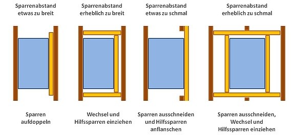 Vier Diagramme zeigen Holzrahmen mit Sparrenabständen und Wechsel- und Hilfspaaren.