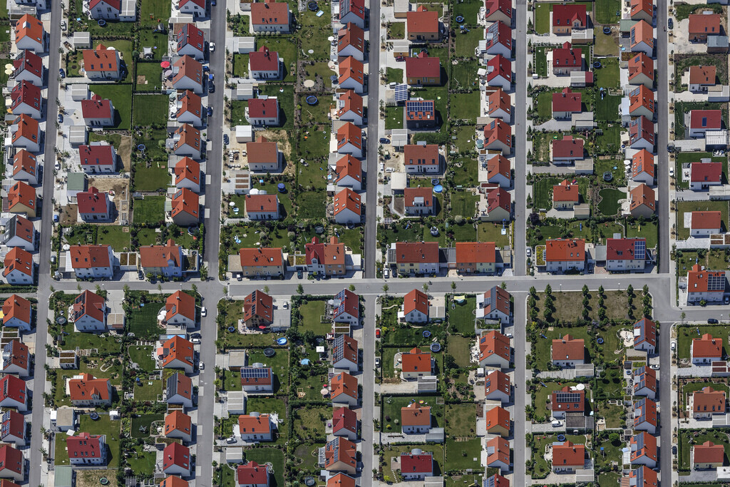 Luftaufnahme eines Wohnviertels mit vielen roten Dächern, grünen Gärten und geradlinigem Straßenraster.