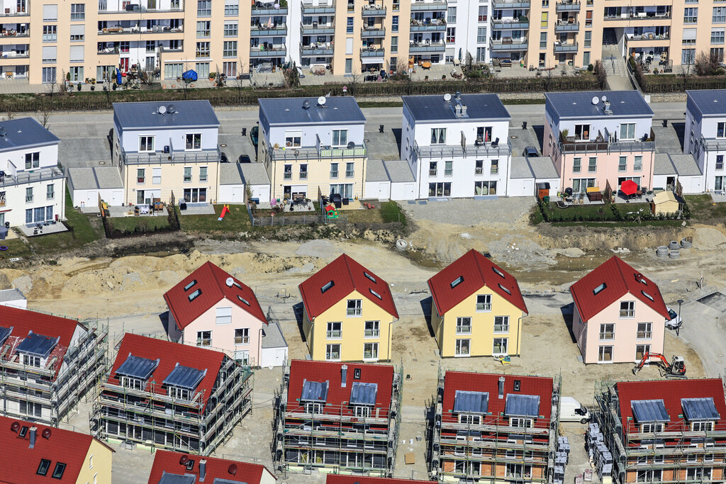 Neubauviertel mit roten Dächern und Baugerüsten; dahinter Mehrfamilienhäuser.