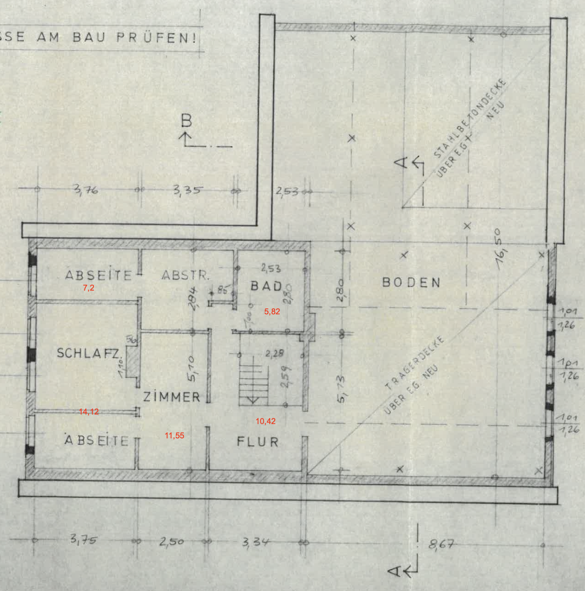 Ich habe Zugriff auf die Bauakte von 1982 (inkl. Statik, zumindest von dem Umbau) und habe auf dieser Basis einen möglichen Umbau geplant. Bilder, Grundrisse und Statik habe ich unten angehängt.