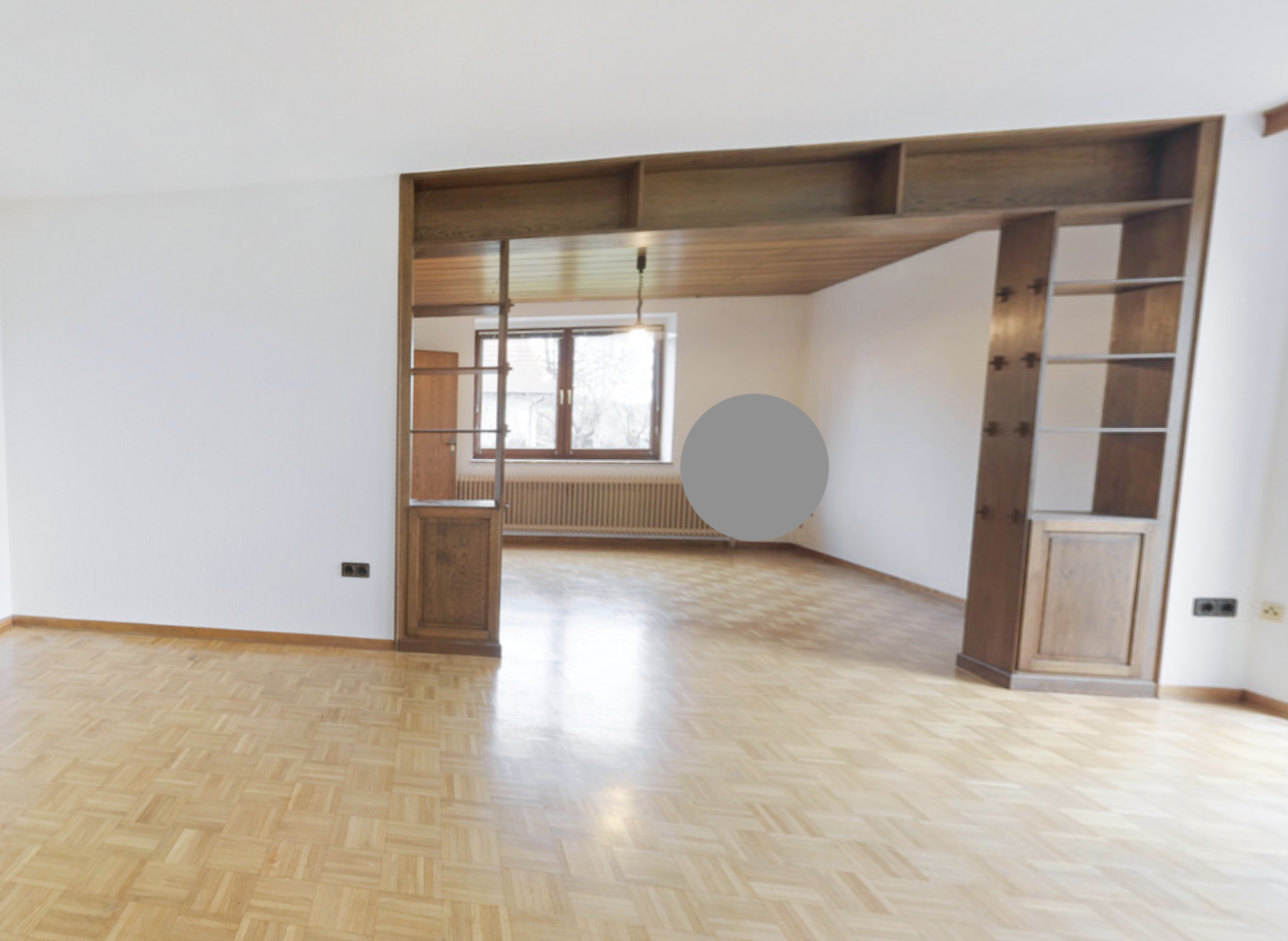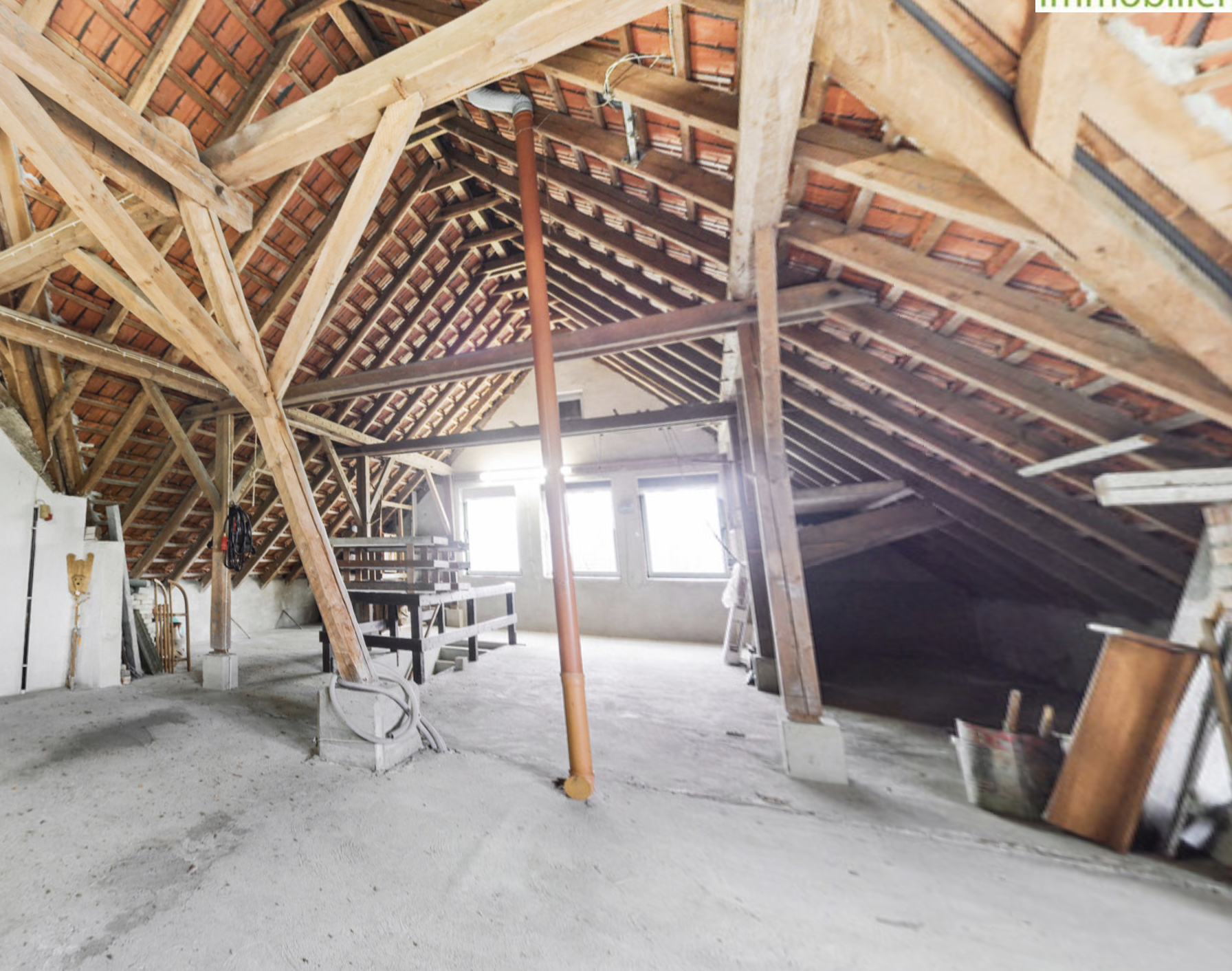 Rückbau mehrerer Innenwände (zwischen Kinder/Eltern sowie Eltern/Bad), darüber liegt eine Holzbalkendecke mit ausgebauten DG.