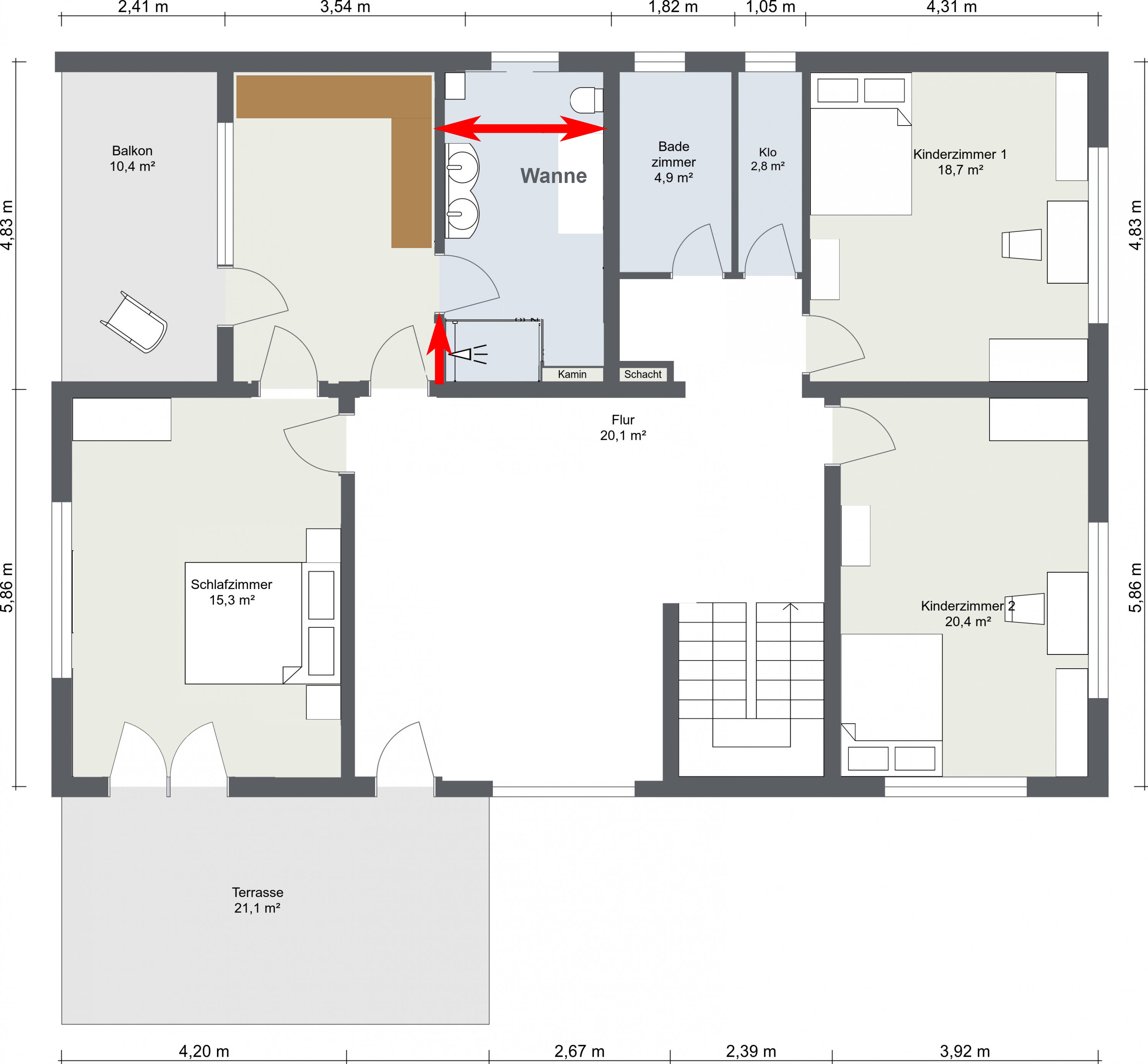 Ist das Elternbad auch schon fertig? Oder wird das mit renoviert? Falls ja, würde ich es verbreitern und die Tür versetzen.