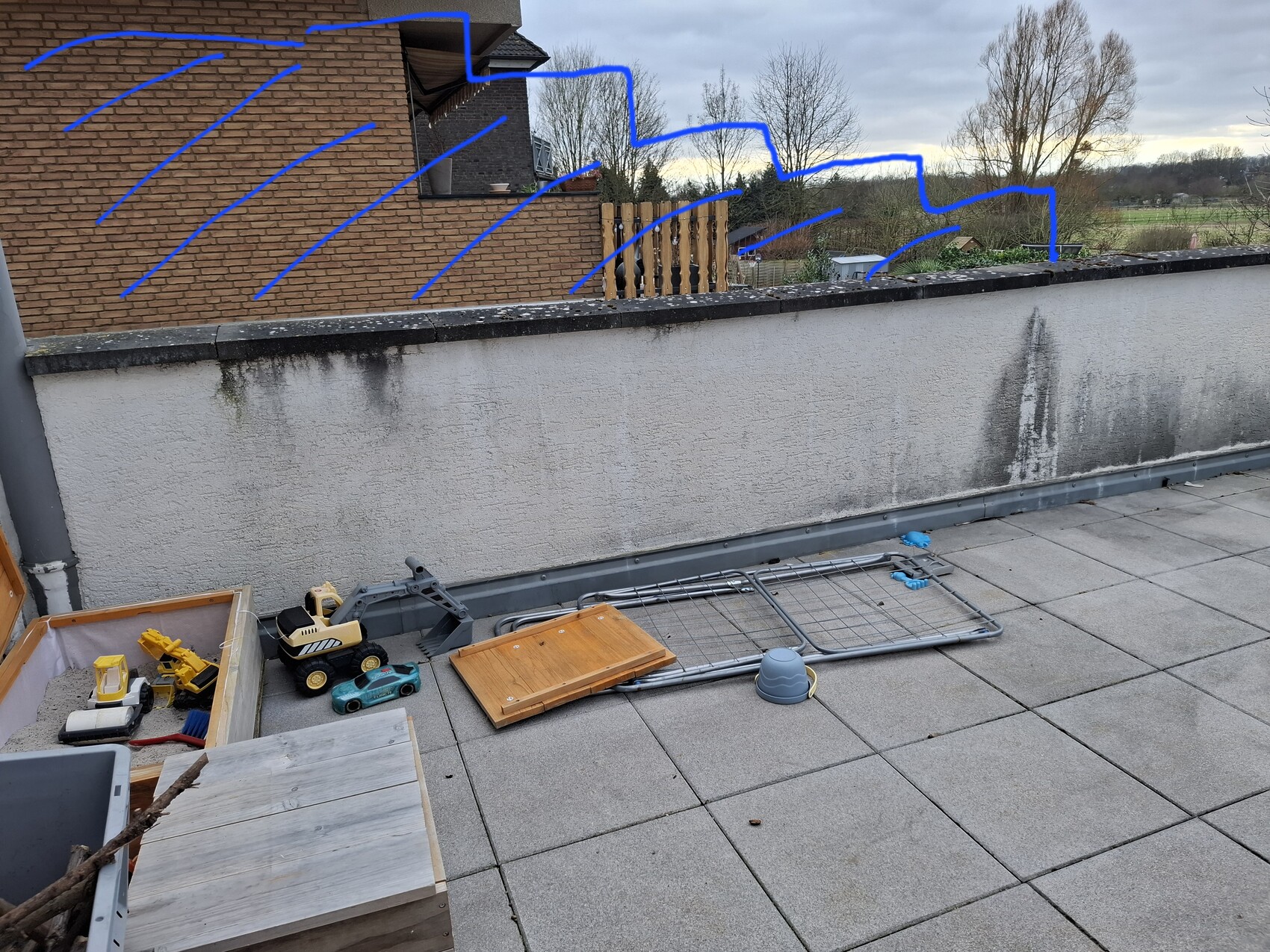 Die Mauer soll an der Hauswand auf ca. 1,90m Höhe enden. Wir wohnen am Hang direkt am Feld. Der Wind kann also schon mal ordentlich ums Haus Peitschen.