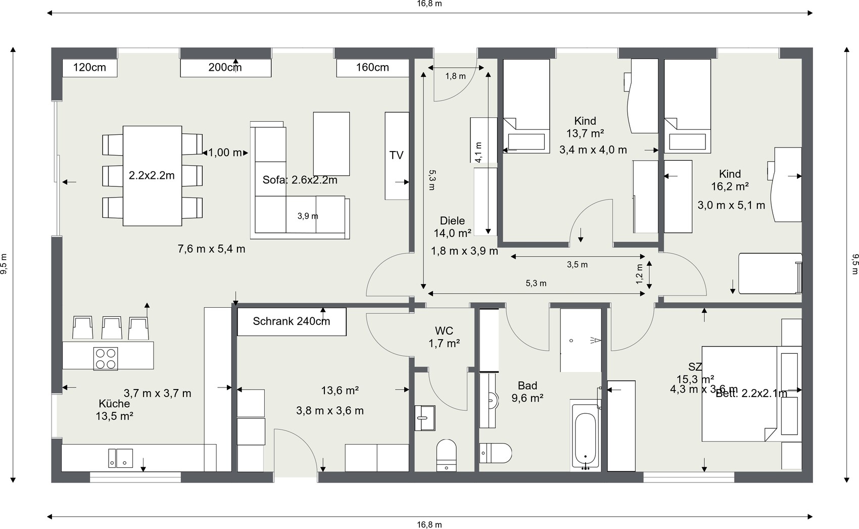 Wo lagert Bettwäsche, Handtücher, Decken, Koffer, Winterjacken, Schal, Mütze, Handschuhe, Sporttaschen usw.? Alles im Hauswirtschaftsraum? Steht da auch Eimer, Staubsauger, Werkzeug, Putzmittel, Besen und ähnliches? Das wird interessant. Am Ende stehen die Schränke doch in der Raummitte.