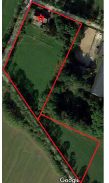 Luftbild eines Grundstücks mit roten Grenzlinien und markiertem Haus.