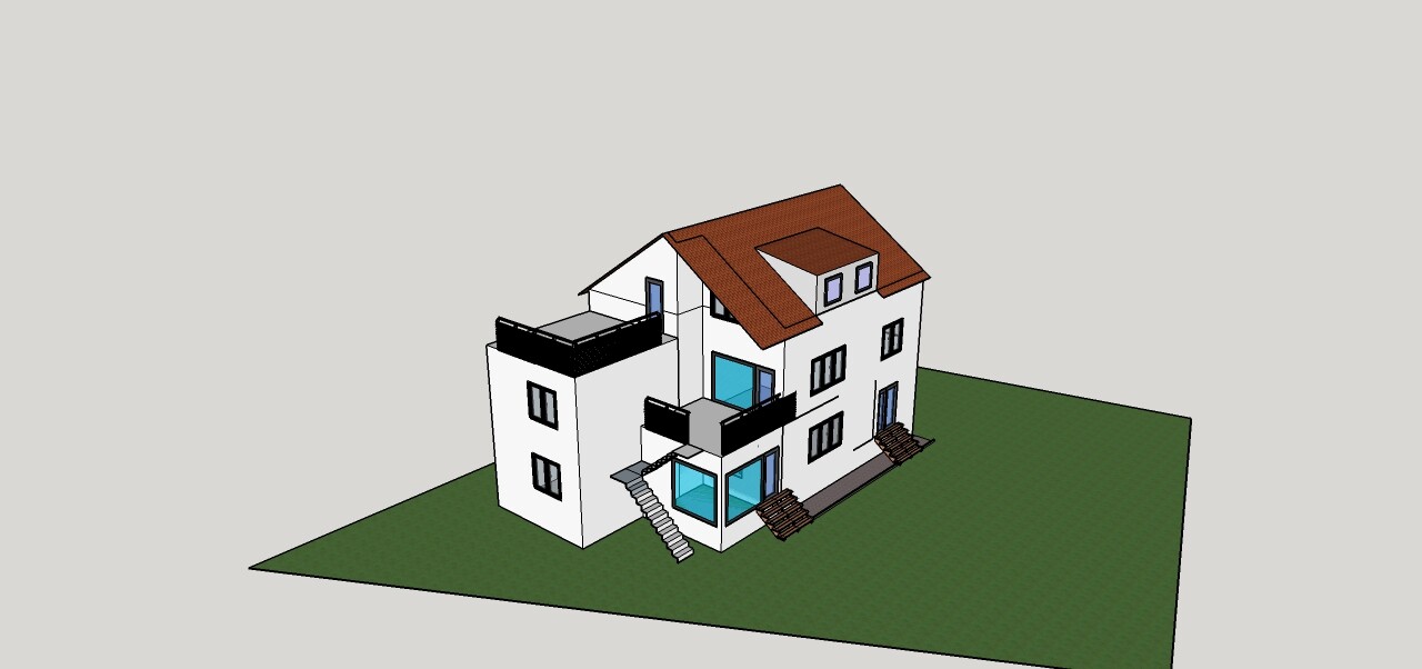 3. Aufstockung des Daches (mit weniger Neigung?), so dass im jetzigen Dachboden drei Schlafzimmer mit Bad und Abstellkammer entstehen.