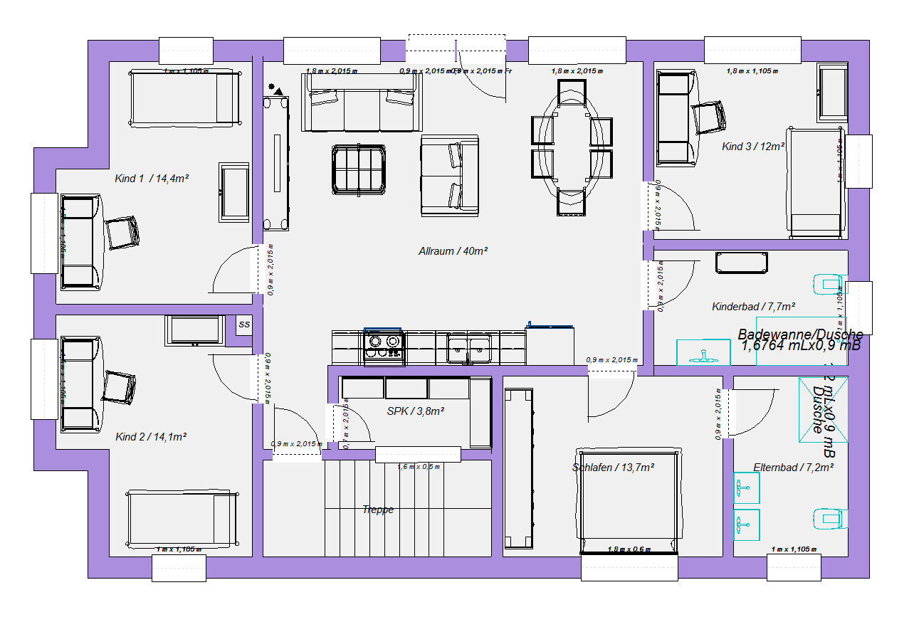Ok, hier noch ein ganz anderer Ansatz. Allraum als Zentrum - keine Flure - keine Platzverschwendung. Möbelrücken kann man sicher noch optimieren. Küche auch als einzelne Zeile planunten möglich. Schallschutz ist hier sicher ein Thema, das muss ich beim Bau einfach von vornherein einplanen.