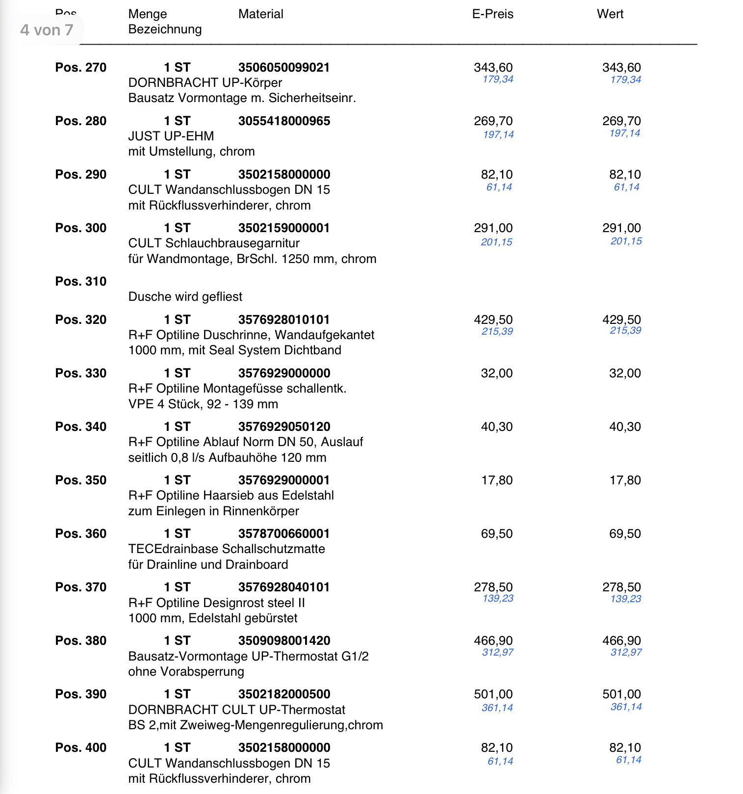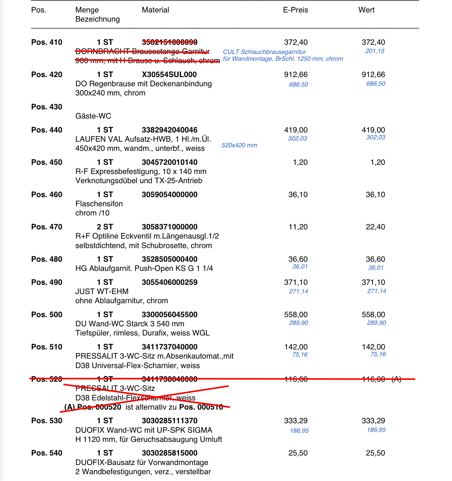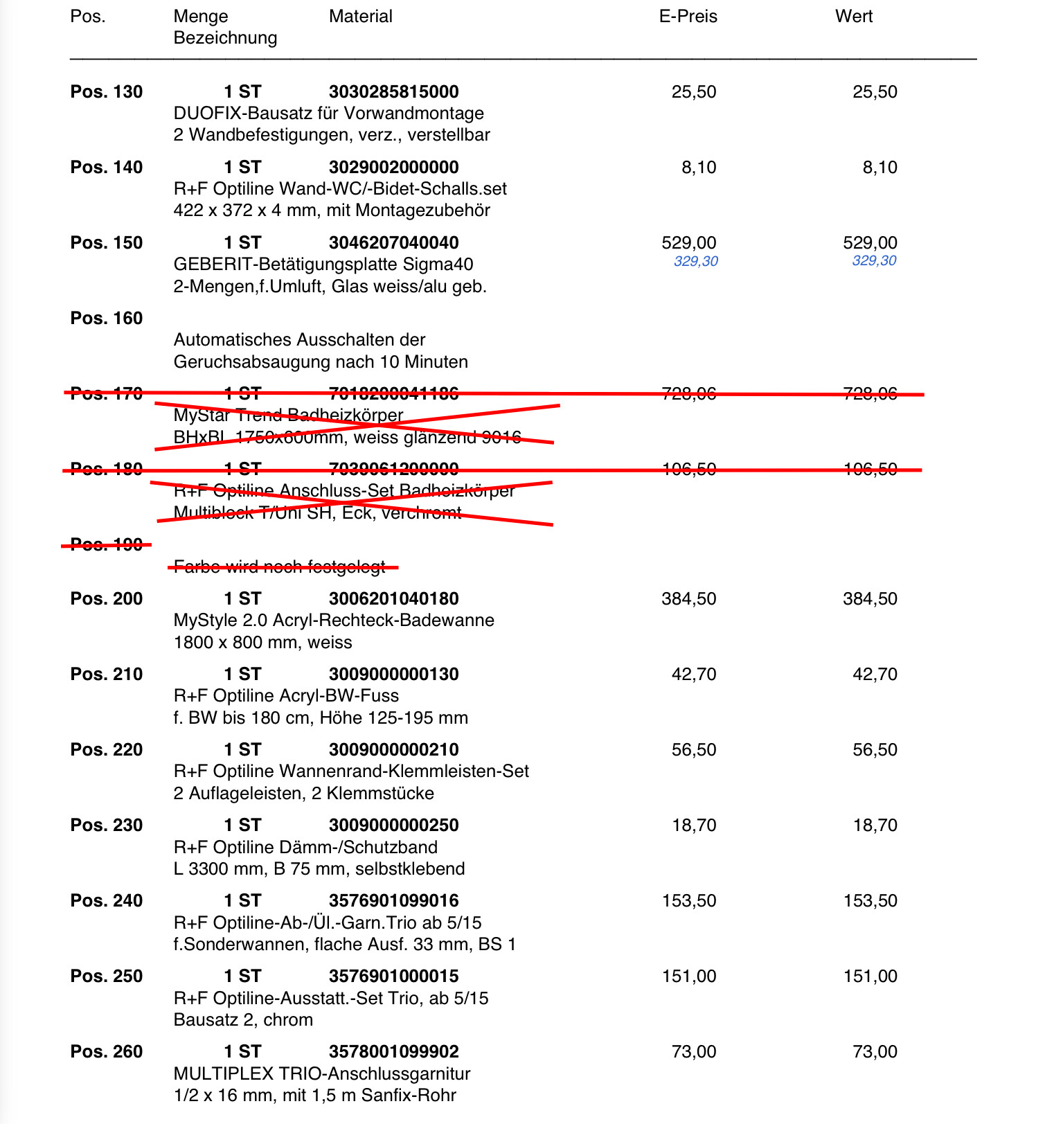 Wie schaffst du es bei Reuters für 7500€ zu konfigurieren? Whirlwanne oder derartiges dabei?Nee, nichts Besonderes aus meiner Sicht. Allenfalls die Geberit DuoFresh vielleicht, die fliegen aber vermutlich raus, den Olf muss dann halt die Kontrollierte-Wohnraumlüftung rausschaffen. Ansonsten finde ich da jetzt nichts so Außergewöhnliches dabei.(Preise in blau ist Reuter, brutto. Preise in schwarz ist Großhandel und zwar netto!)