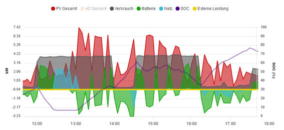 Warum soll noch ein Speicher kommen?hier ein guter Grund für Speicher (wenn er nicht zu teuer ist). Das Auto lädt kontinuierlich mit 3.5KW trotz Wolken und Sonne im steten Wechsel. Das Beispiel ist von heute und geladen wurde ein Mazda MX30